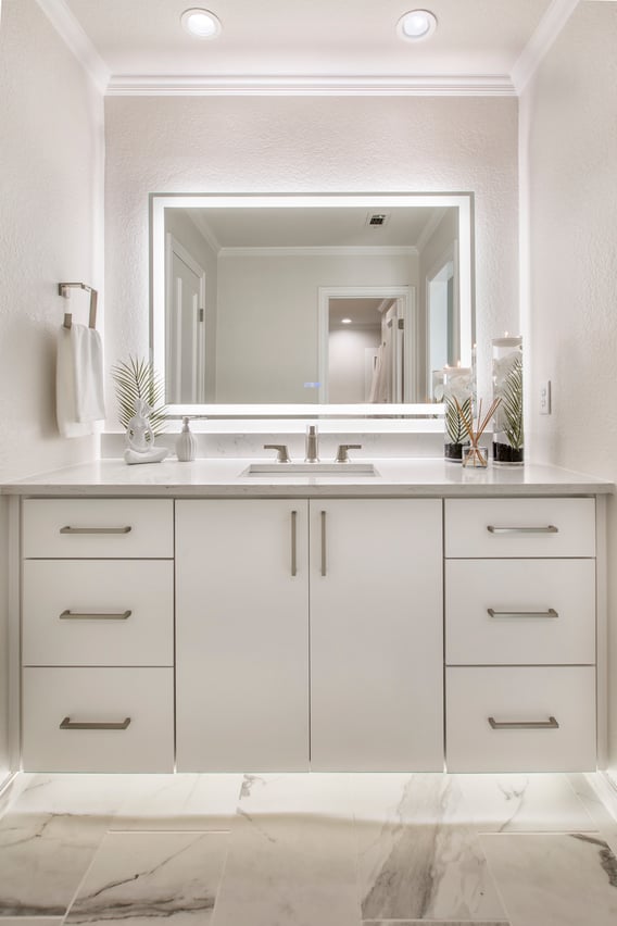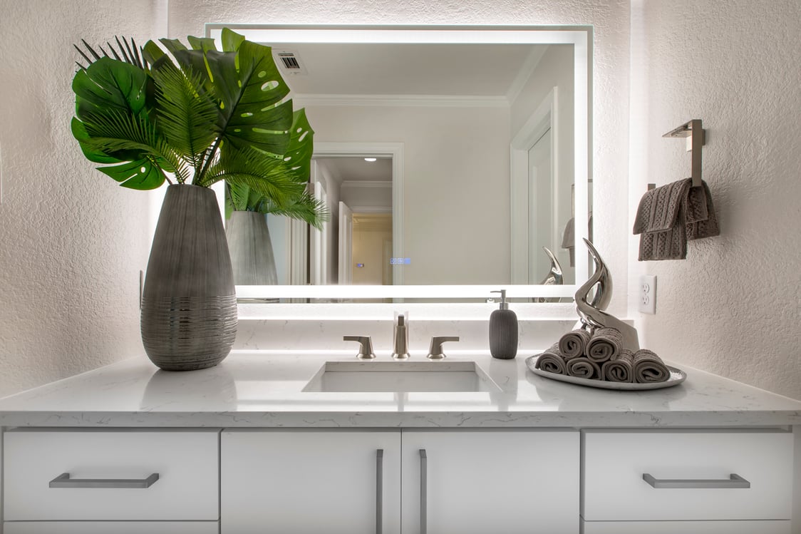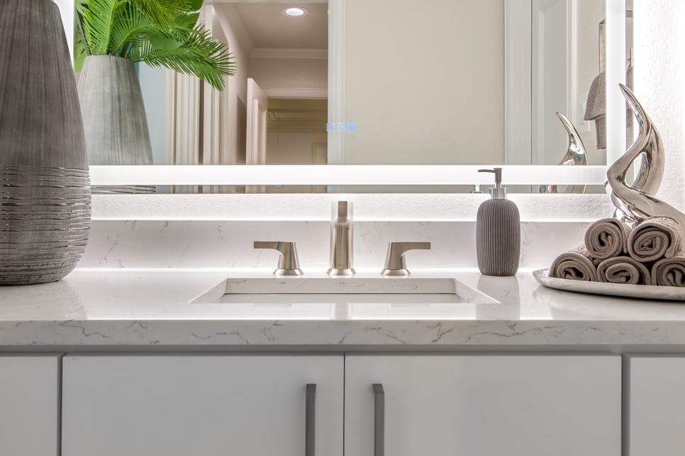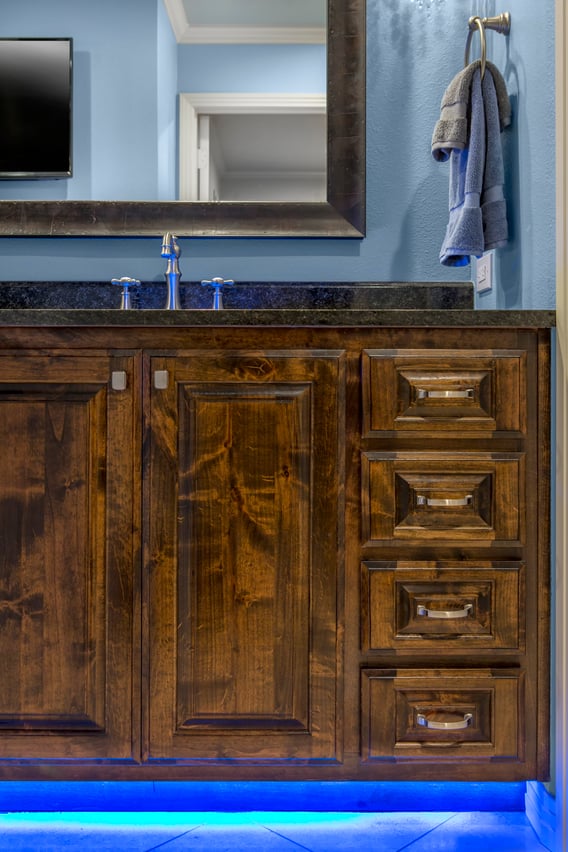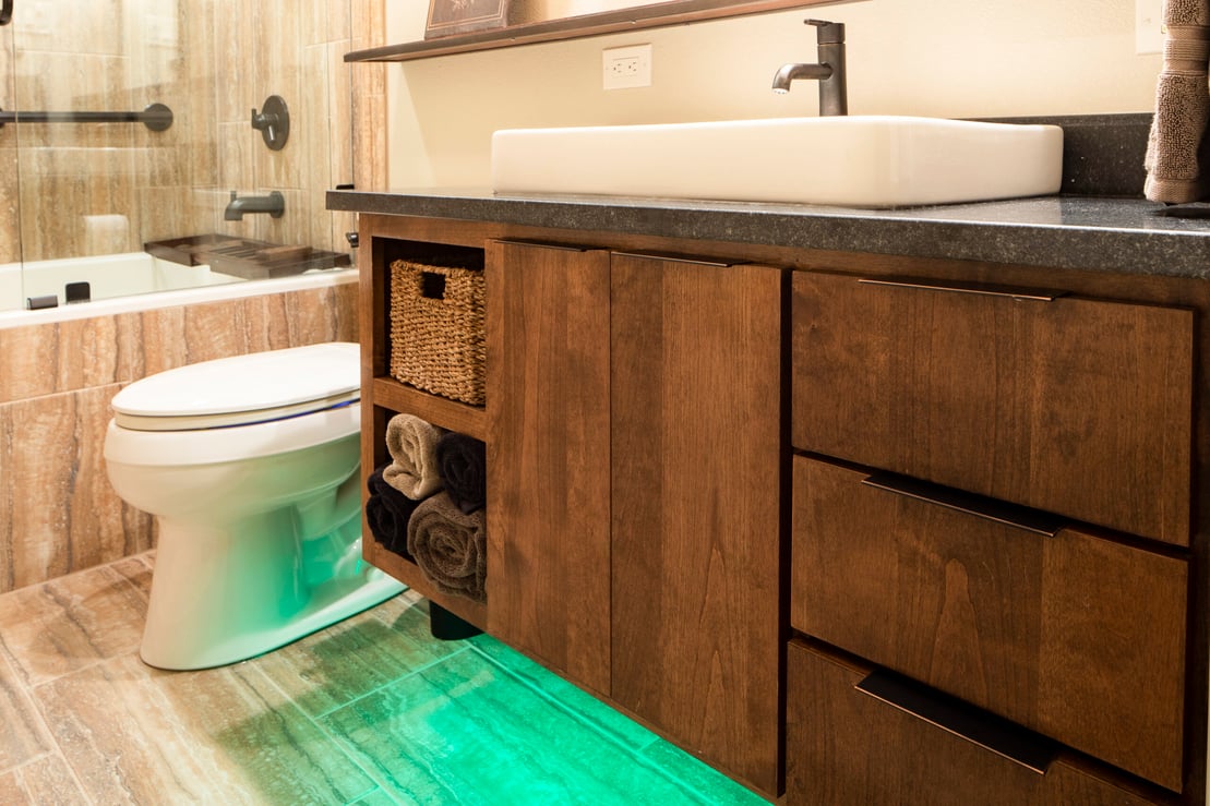 Lighting is one of the best ways to change the mood of a room. LED lighting behind mirrors, vanities, or toe kicks is a unique way to create visual interest or set the tone for a relaxing soak in the tub. Depending on what you choose, some LED features can even change colors! Talk about a true wow-factor!