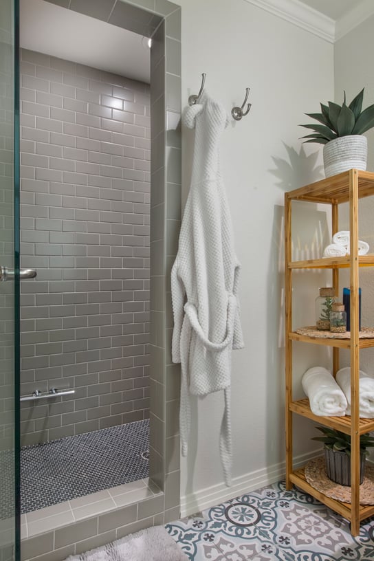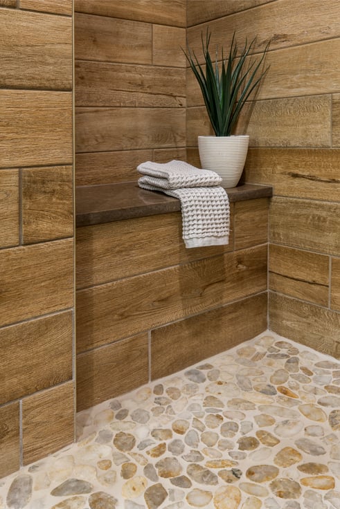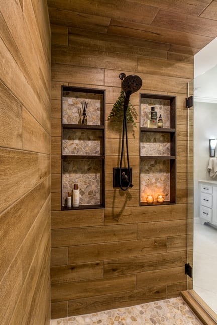 Many of our bathroom remodels include walk-in showers that incorporate a pony wall. Our designers love this layout because it provides the perfect place for the shower valve! This might not seem like a luxury feature, but the ability to turn on the water without being directly under the showerhead or getting your arm wet in the process is something everyone will appreciate. This also allows for towel hooks to be placed within reach from the valve, so you can grab your dry towel as soon as you turn off the water.
