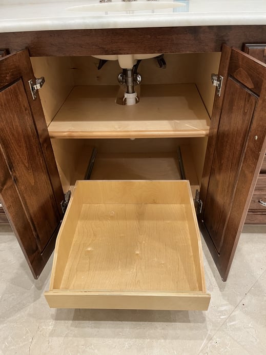If you’ve read any of our project blogs on kitchens, you know that we always suggest drawers below the counter for improved storage space and easy access. The same is true in the bathroom – include drawers where you can! For the open cabinet space that is below the sink, our designers typically recommend a large roll-out with an electrical outlet included. This feature makes it so much easier to access items below the counter while still allowing access to the plumbing if there was ever an issue with the sink. Many of our clients use the outlet here to dock items like electric toothbrushes or razors. Yet another convenient place to store and charge items without having to clutter the counter.