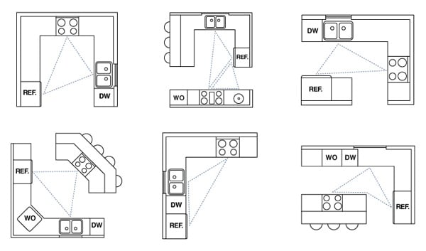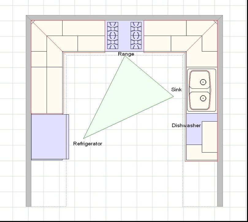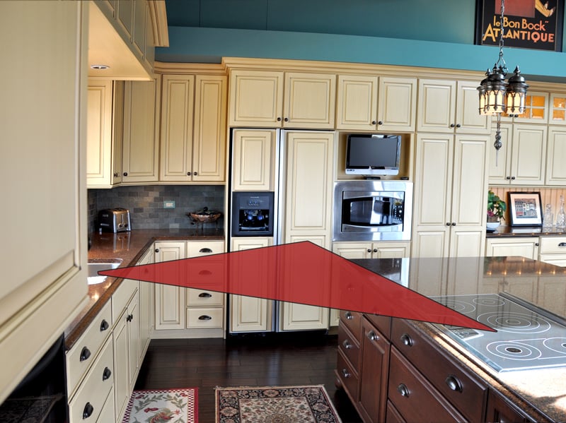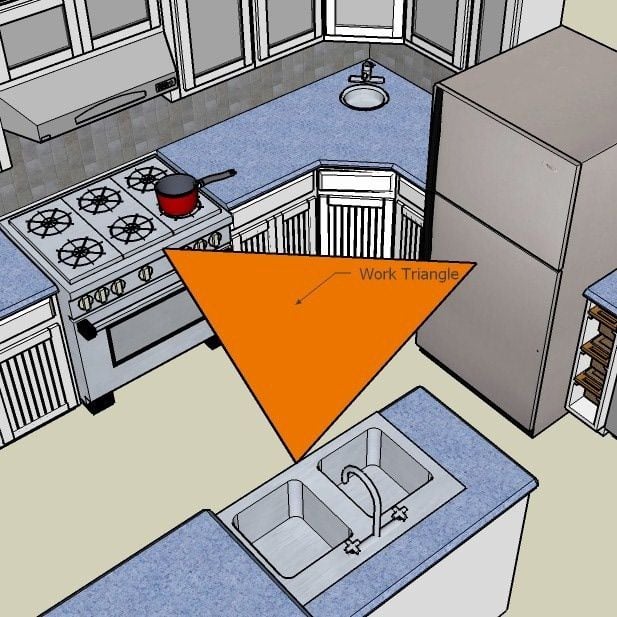 This is a very important point to remember. It might be difficult in small kitchens, but if your kitchen has the space, try to keep the work triangle out of the main walkway to prevent thru-traffic and overcrowding the cook.