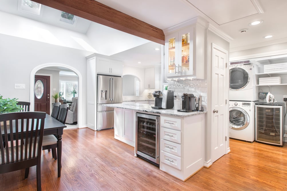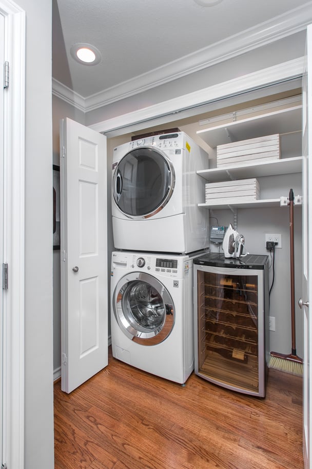 Lastly, just around the corner from the new kitchen is a reconfigured laundry closet. Stacked washer and dryer sit alongside storage shelving and a second wine fridge, all of which is easily concealed behind a folding door. The area is conveniently located just across from the client’s master bedroom, making for a short trip to put away clean laundry.