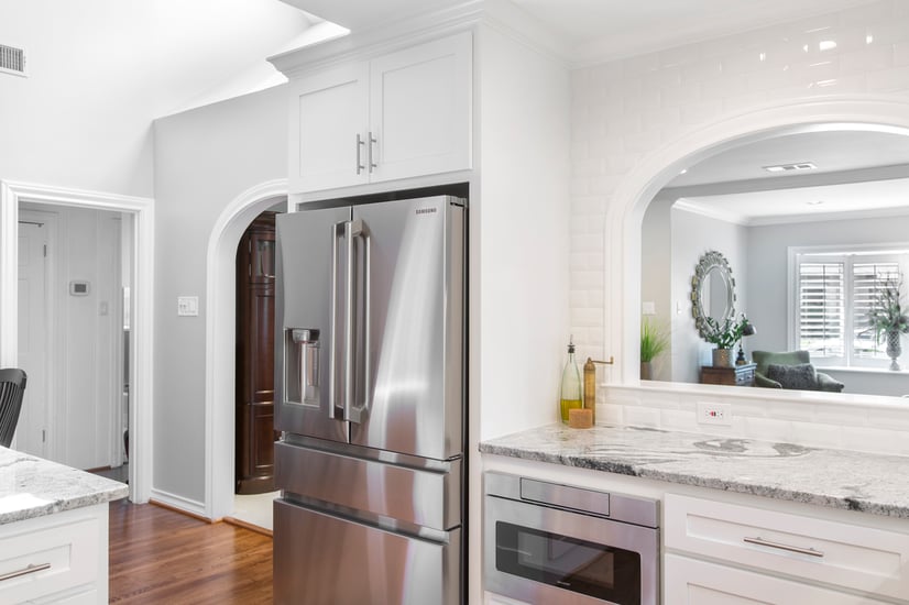 Another design flaw in the original kitchen was that the footprint simply was not made to suit the larger appliances of today. The oversized fridge was too massive for the room, especially as it sat in the only existing walkway to the master bedroom. We relocated the fridge to the other side of the kitchen where it is conveniently within reach. One of the rules we try to follow with every kitchen we design is to avoid placing the refrigerator at the “back” of the kitchen. The end goal is always to provide the most flowing, and functional floorplan while keeping in mind an efficient kitchen work triangle. Placing the fridge at the entrance of the kitchen minimizes traffic and prevents crowding the cook.