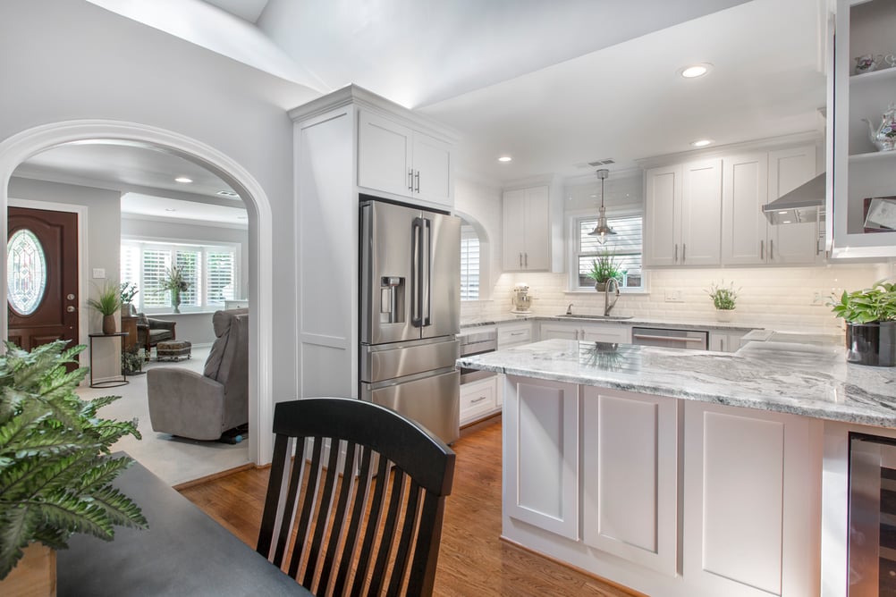 This angle shows the updated pass through to the living room on the left side of the kitchen. The new decorative eyebrow provides much more aesthetic appeal than the previous rectangular cut, and also goes well with the new granite counter tops, beveled subway tile backsplash, and white shaker-style cabinetry.