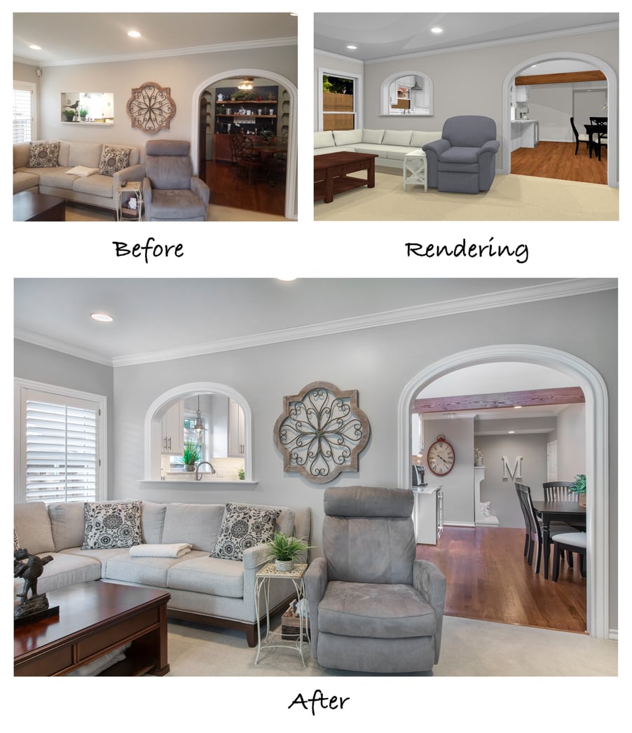 Upon entering the front door, you can already see the structural and aesthetic changes that were made. The small, dark dining area is now open and brightly lit from the window in the kitchen. The pass-through into the living area was reframed with a decorative eyebrow to match the arch and style of the doorway for a consistent, updated look.