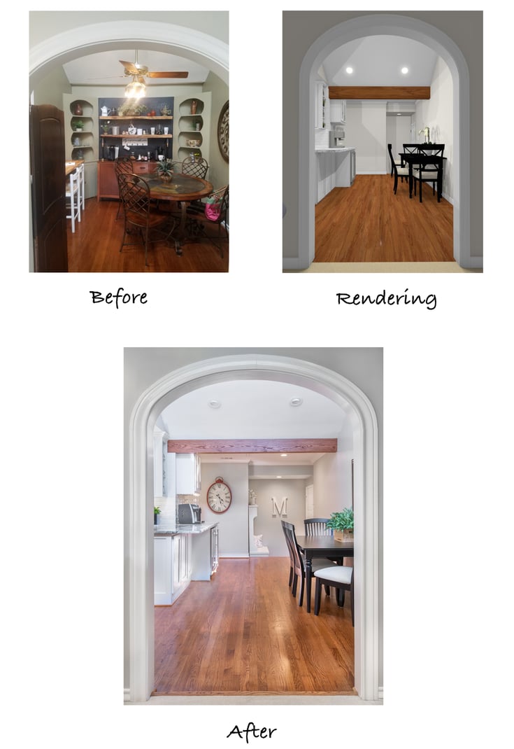 By removing the back wall completely, the dining room was joined to the neighboring hallway, creating an open, flowing space. We inverted a support beam into the attic and installed an exposed beam to hide the uneven ceiling levels between the spaces. The stain on the beam matches the hardwood flooring and ties the design together while also creating some dimension and visual interest in the room. Strategically placed LED can lights were installed to replace the low-hanging fan, making the ceilings seem higher.