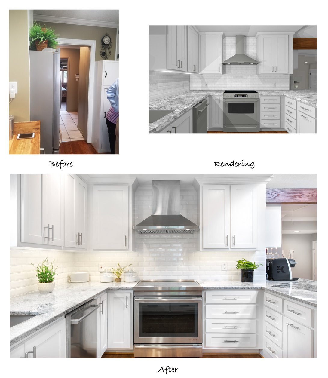 In the before picture, our owner, Mike Medford Sr, chats with the clients about the structural changes that will take place in their home. You can see that the dividing wall between the kitchen and dining area was removed, really enlarging and brightening the space. The breakfast bar previously sat within a small pass-through window just beside the kitchen doorway, creating an awkward, choppy wall and a cramped eating area. The remodeled version is much more spacious, with ample counter space for family and guests to sit without feeling crowded.