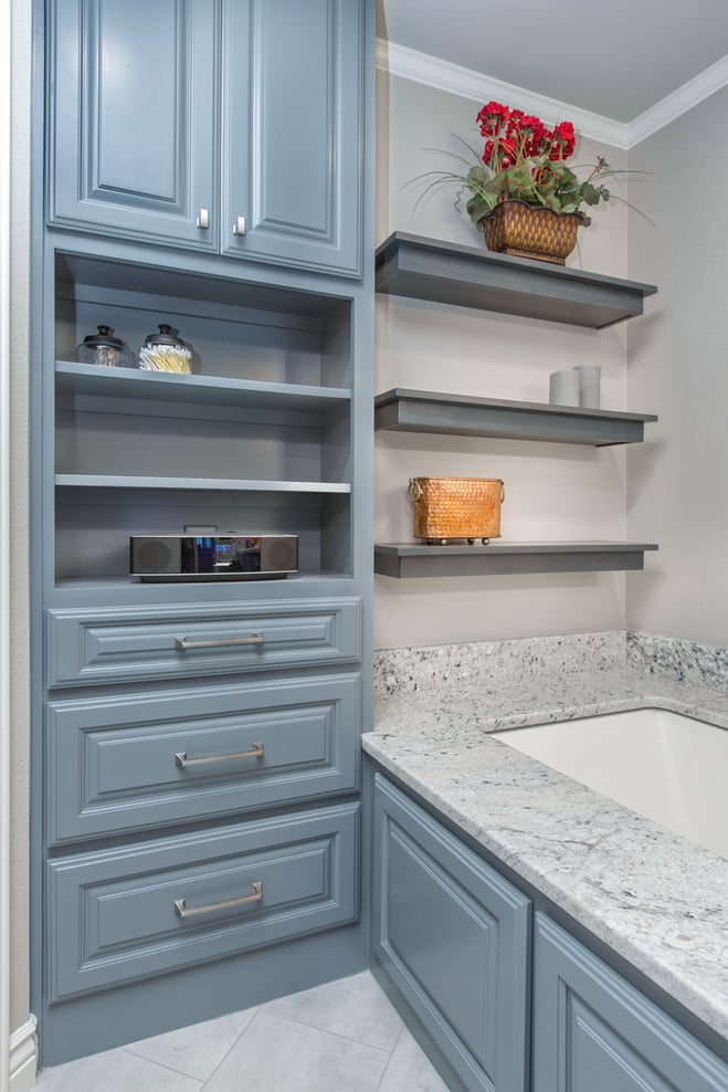 The custom panels around the tub box all open, allowing for additional storage and easy access to plumbing lines. Placing the new tub flush against the wall provided enough space for a custom linen cabinet, complete with drawers, shelving, and upper cabinets. Our talented carpenter, Dave, was also able to build some custom floating shelves that we hung over the end of the tub. What a perfect place for our clients to display colorful flowers, candles, and other decorative trinkets!