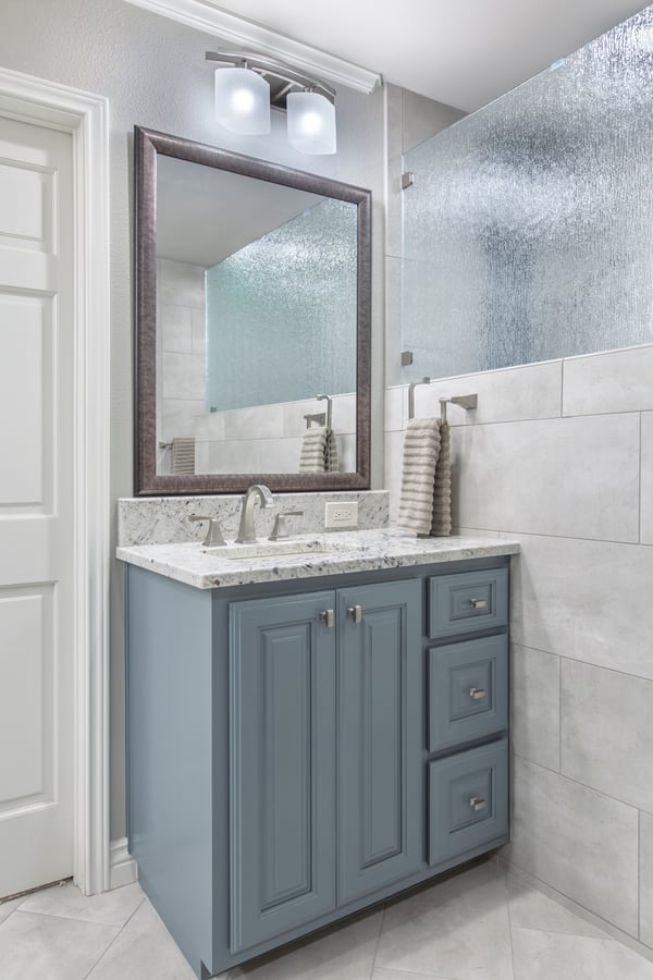 Our team was also able to install new, larger cabinets above the toilet for additional storage space. The color of the tile racing stripe matches well with the paint color of the cabinetry, really providing a cohesive, consistent aesthetic throughout the entire bathroom.