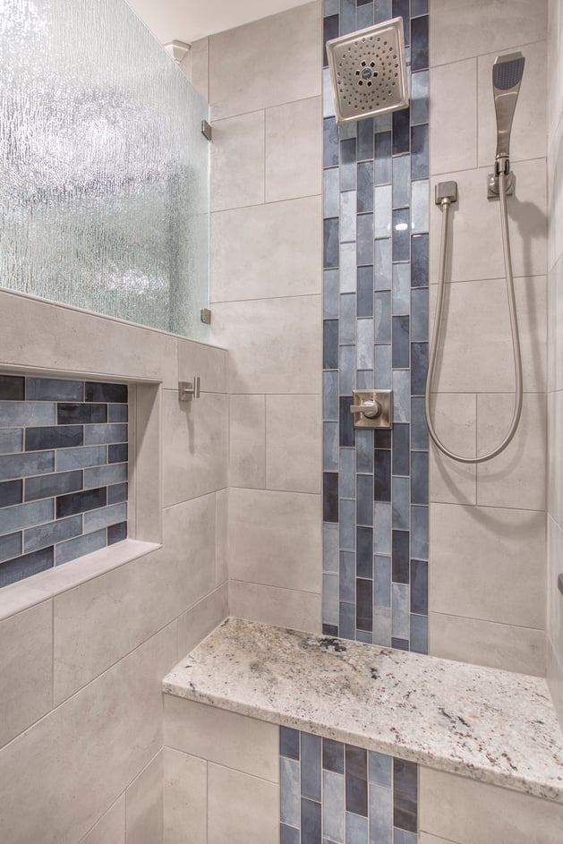 Inside the shower is a custom bench and soap niche, tiled to match the accent stripe. The rain shower head, hand shower, and cloth holder all compliment the design with a satin nickel finish. The 5-foot pony wall is accented with beautiful obscured “rain” glass to add visual interest and allow light into the shower while still providing ample privacy.