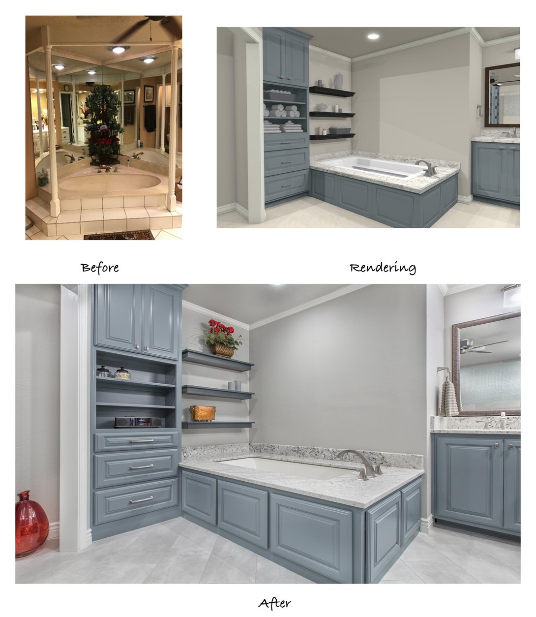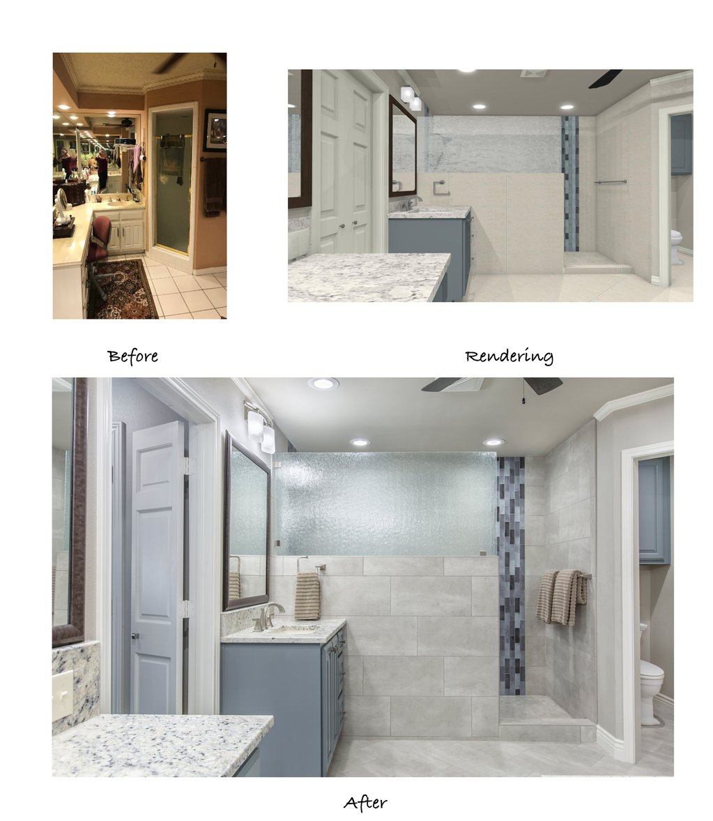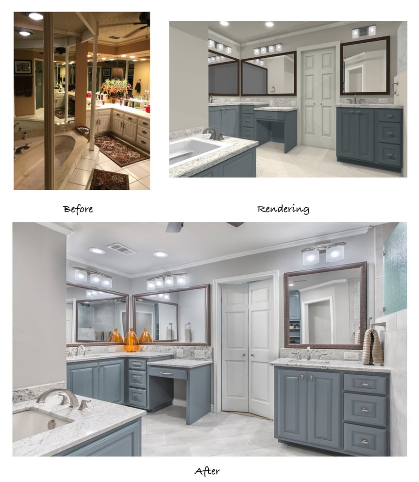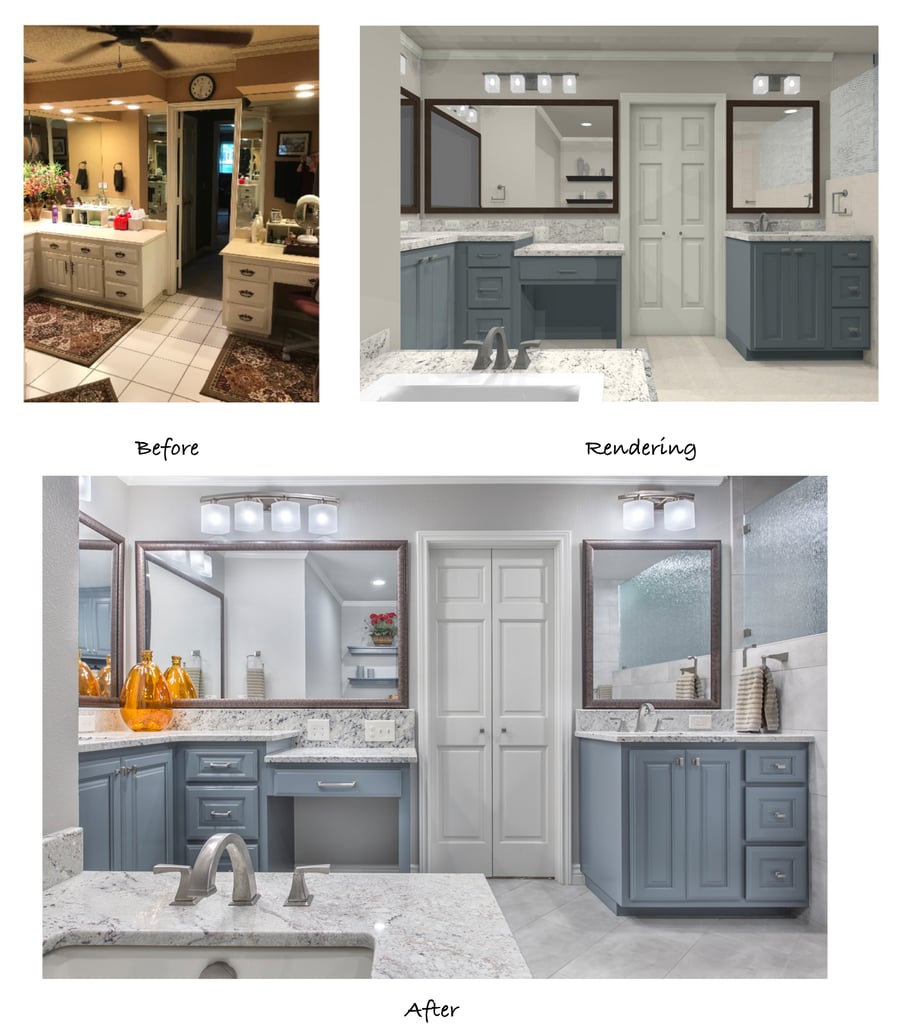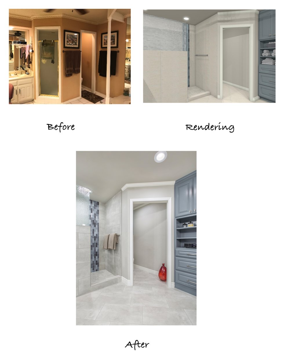 The rendering and after photo show what a drastic change was made! Converting this side of the bathroom to the “his” side, we were able to replace the large vanity with a single 36-inch “man-sized” version (still with plenty of drawers and storage space for him!) The extra space from the removed vanity created the perfect area for a large walk-in shower.