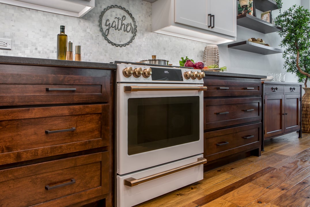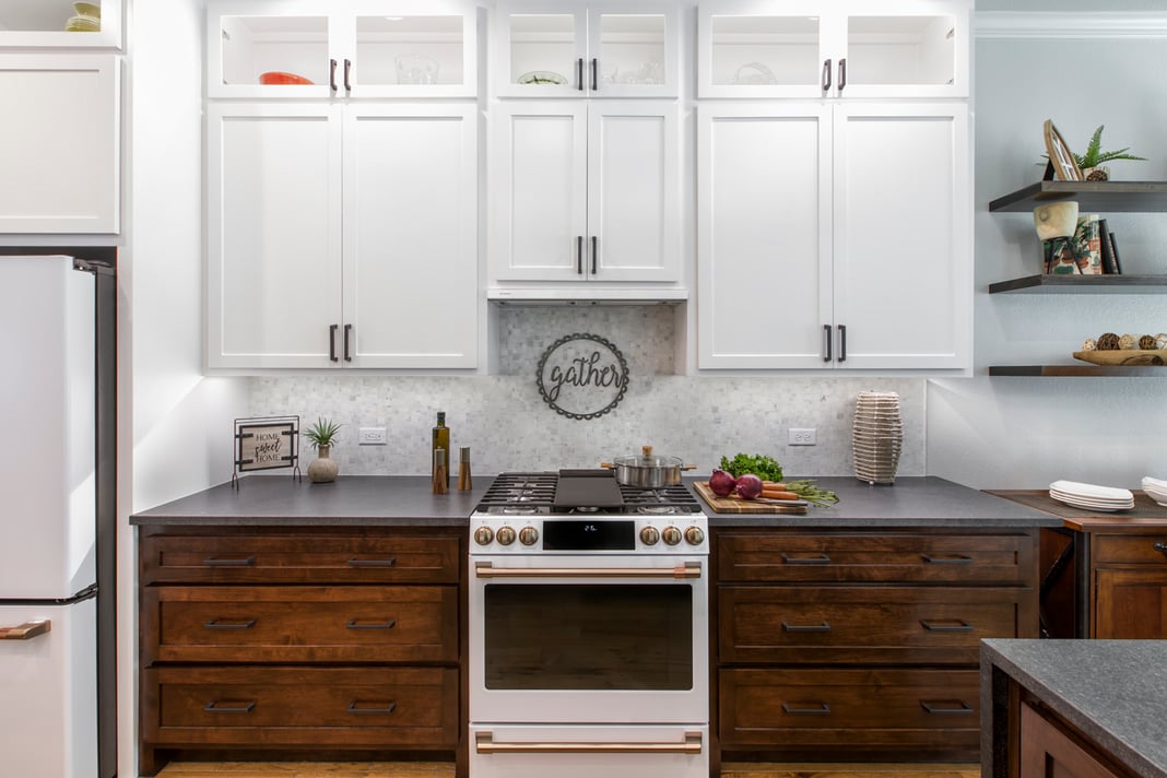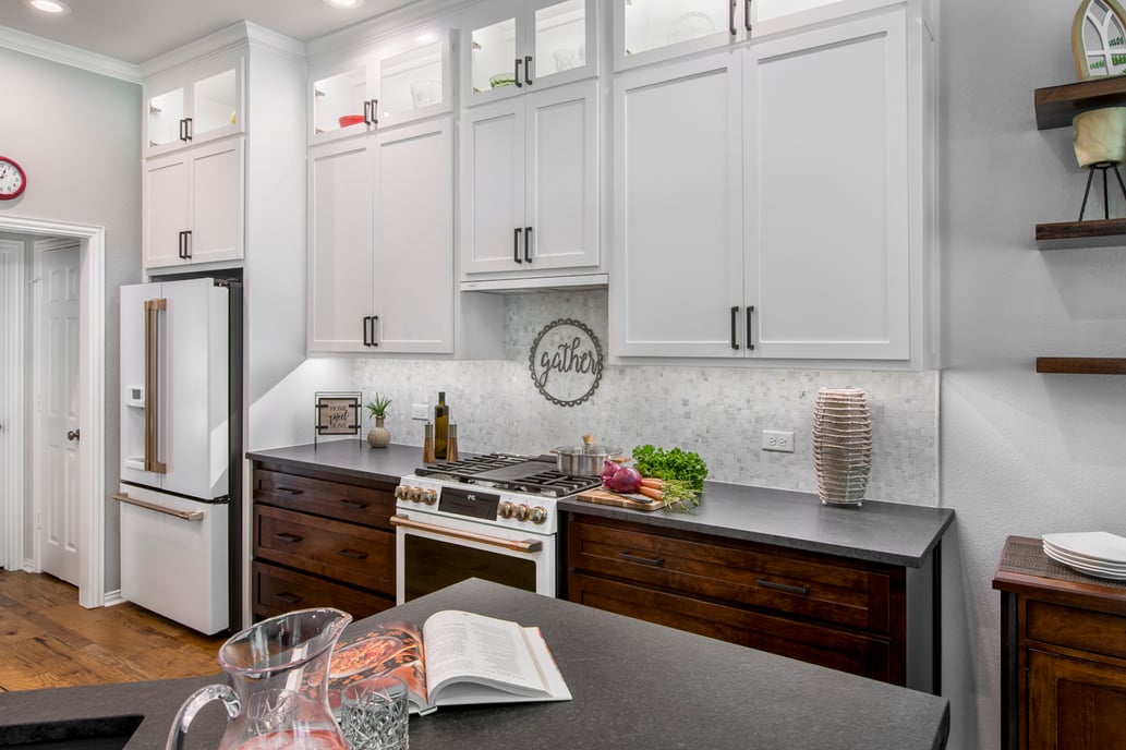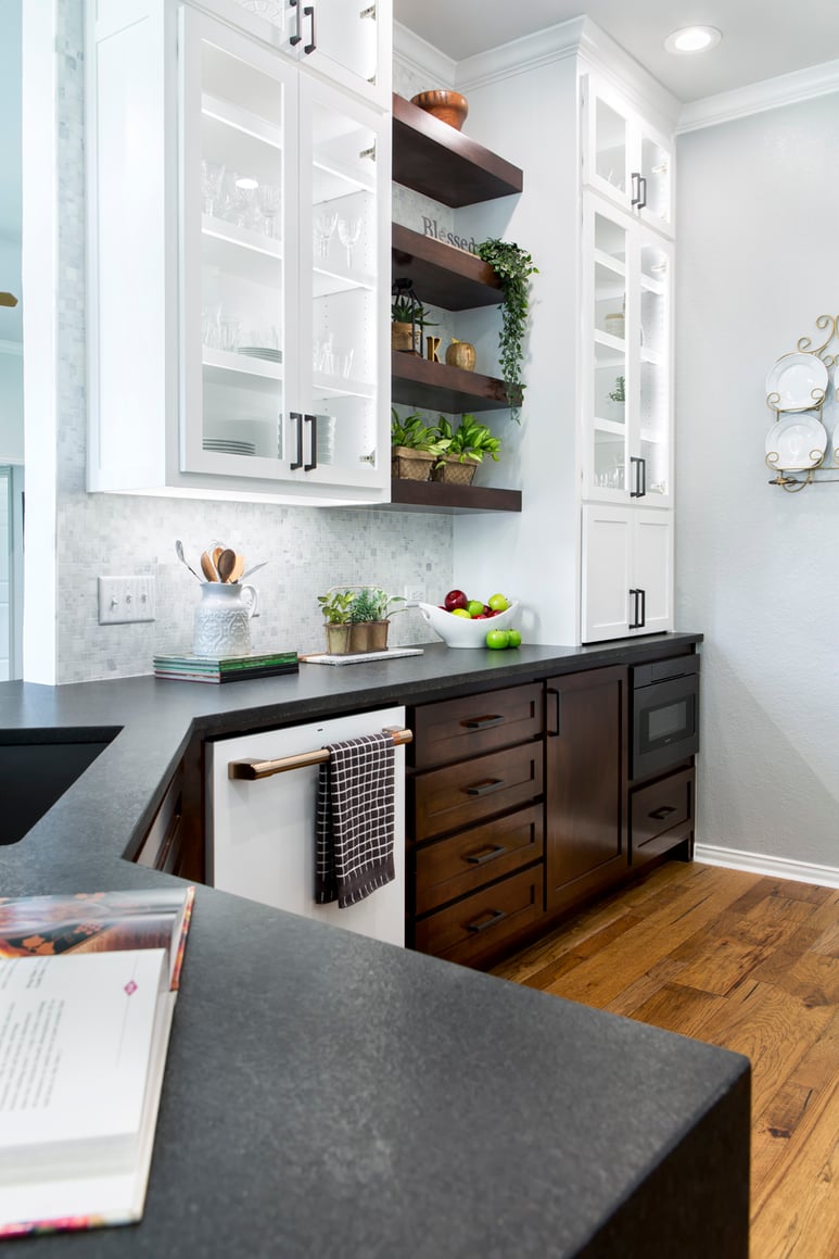 A very popular trend in kitchen design right now is two-tone cabinetry: when the upper cabinets and lower cabinets are different colors or stains. Our clients loved this idea and shared some inspiration photos showing a mixture of stained wood cabinets, white paint, and dark countertops. They also loved the high-end look of glass front accent cabinets, open shelving, and shaker-style cabinet doors.