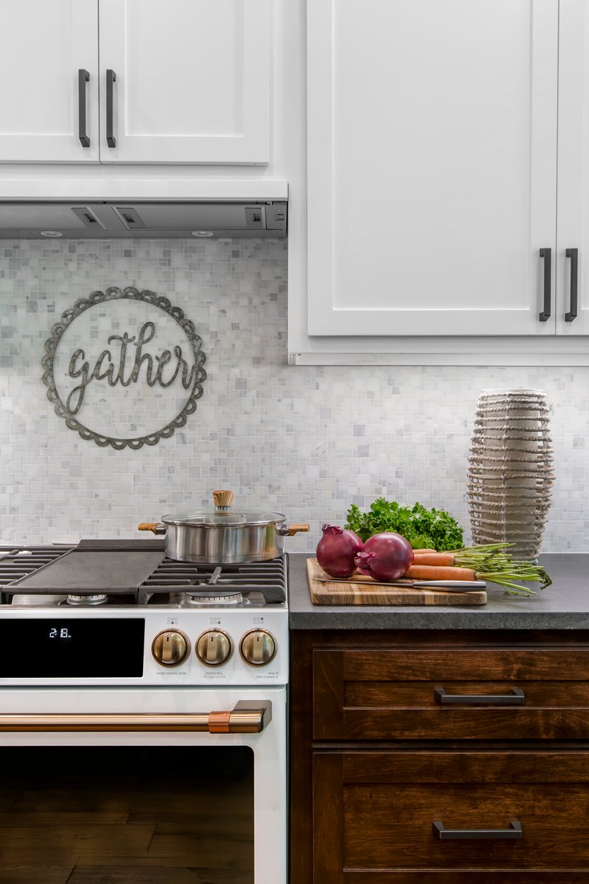 The combination of the taller cabinets, new lighting, and two-toned colors make this kitchen feel larger and more spacious.