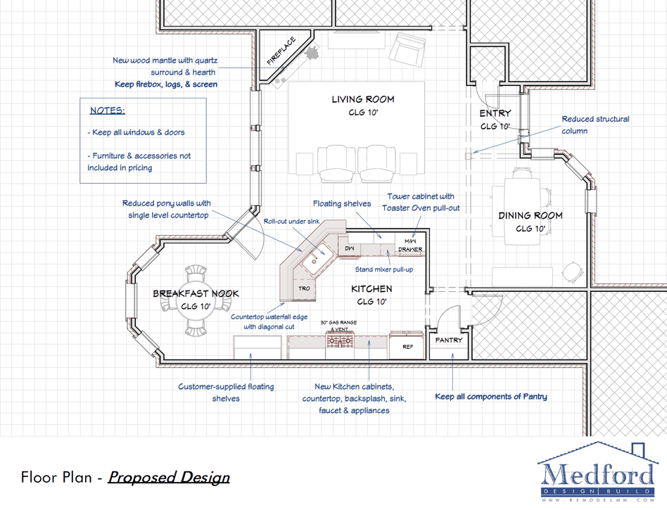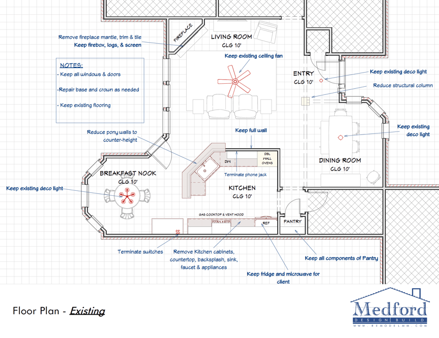 As you can see in the floor plans, there were not any significant structural changes. However, the call-outs listed on the plans defined the many modifications that would be made within the same footprint. These modifications included new cabinets, countertops, backsplash, sink, faucet, and appliances.
