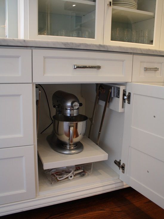 Just below the appliance garage is an under-counter microwave drawer and a full-sized cabinet for the client’s stand mixer. Although we didn’t get a photo of the cabinet open, here is a similar example: