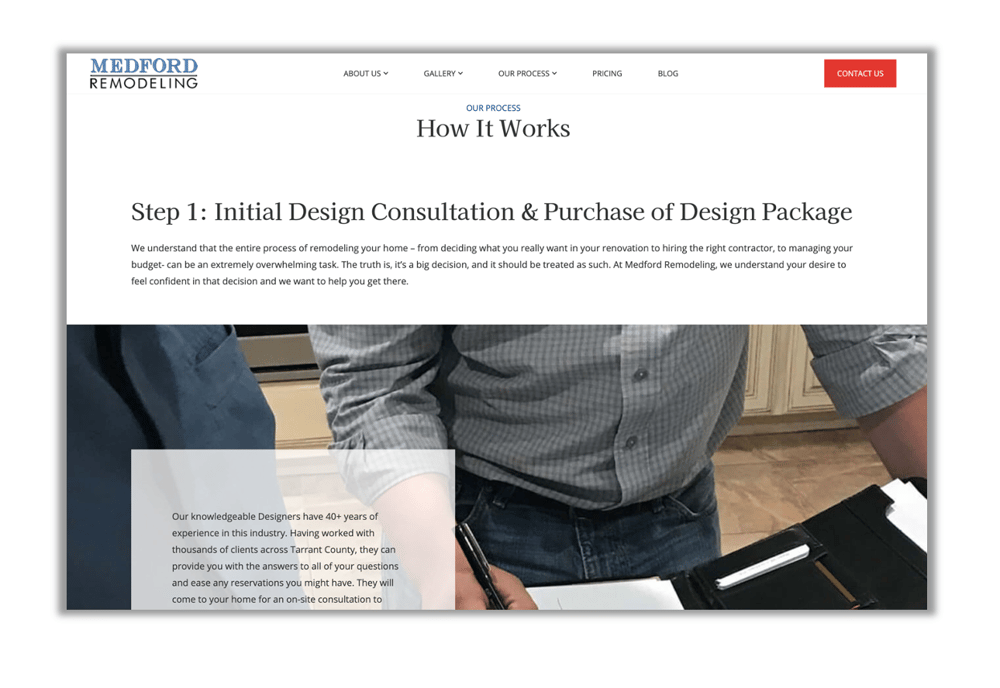 First and foremost, we wanted our website to introduce the Medford Remodeling team, both as Tarrant County’s premier home remodeling company and as friendly, knowledgeable, and experienced professionals in the industry. As a second-generation family-owned business, it’s important to our leaders to showcase the value we place on relationships and family values. The majority of our employees have been a part of the Medford team for over 10 years, so it’s no surprise that we feel more like family members than co-workers! You can get introduced to each member on the Meet the Team page under the Get to Know Us tab. You can also get to know Medford as a company through the Reviews and Locations links under the same tab.