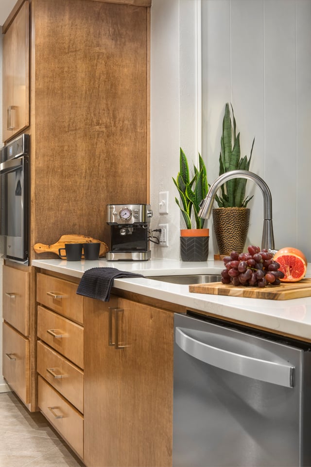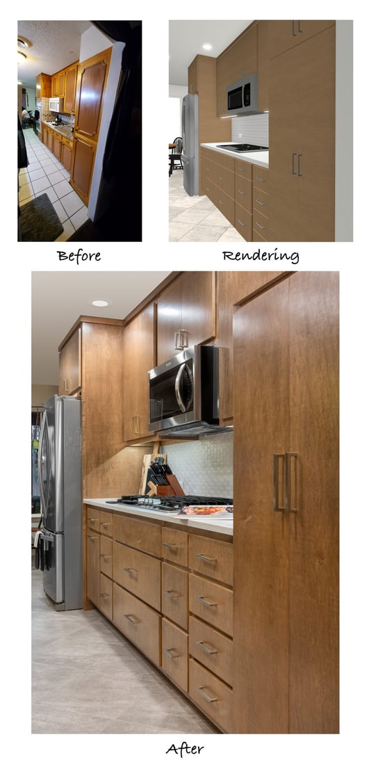 On the back wall of the kitchen, a notable change was removing the walls surrounding the pantry. Not only did this create a cleaner look, but it allowed for significantly more storage space inside the pantry. Freeing up storage space is the ultimate goal when you have a small kitchen! For that same reason, the lower cabinets were replaced with drawers. Often times, drawers are more efficient than lower cabinets because they allow you to use the entire space for storage, instead of having a lot of wasted space in the back of a large cabinet. Drawers are much easier to access and utilize for storing food items, cookware, and heavy dishes.