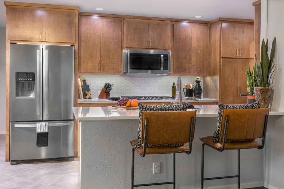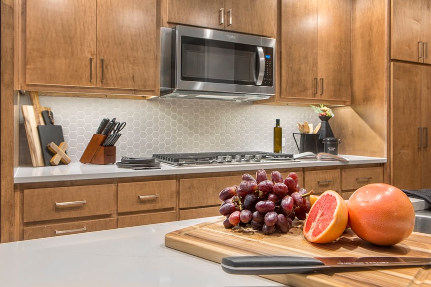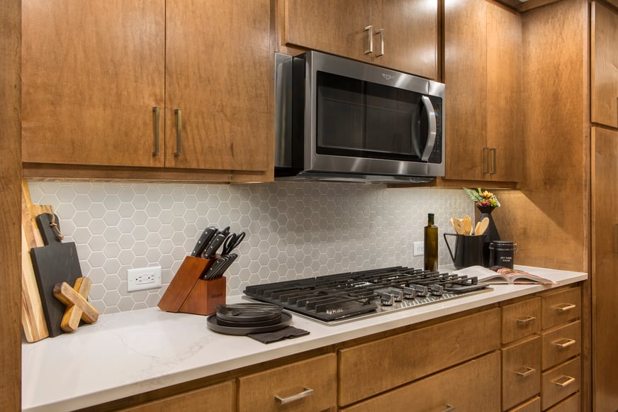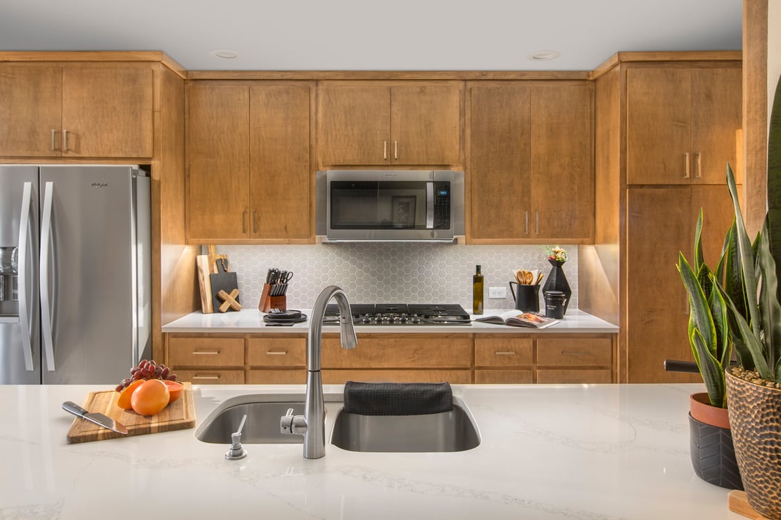Sleek stainless-steel appliances contribute to the streamlined look of the cabinets, and white American Quartz countertops create a nice color contrast against the natural wood tones and satin nickel hardware.
