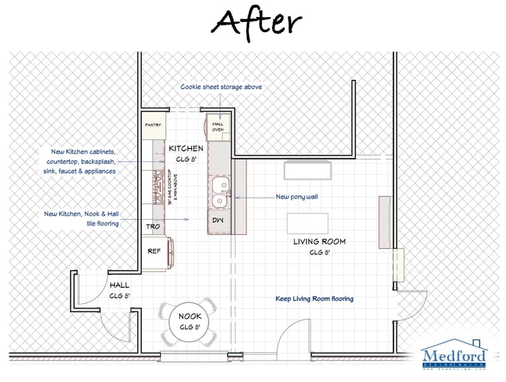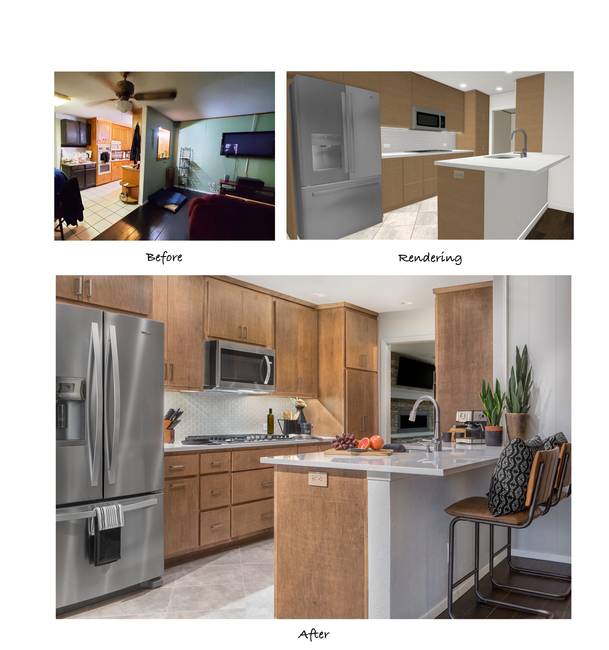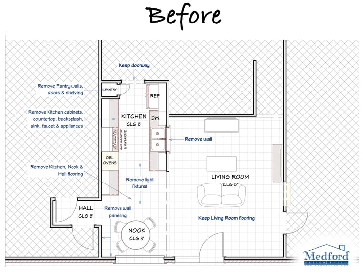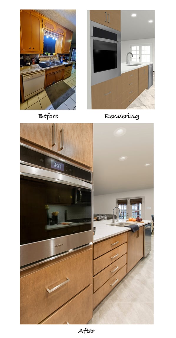 Our client’s home was built in 1965. She inherited the home and knew that it needed to be remodeled, starting with the kitchen. Due to the existing floor plan, the option of completely opening the kitchen into the living room was unrealistic, since that side of the kitchen housed the sink, the dishwasher, and cabinet storage. She met with our team in hopes of updating the kitchen without having to compromise on storage or counter space.