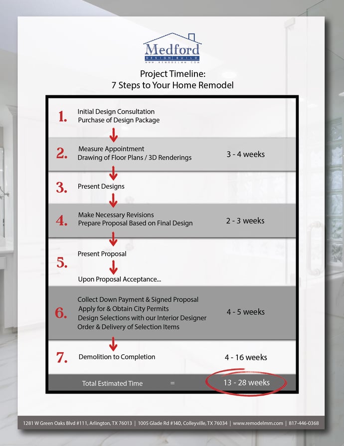 Once the designs are completed, we’ll set up a review meeting at our office to present the renderings, floor plans, and a virtual walk-through. This meeting allows us to note any revisions that need to be made prior to finalizing the designs so that we can estimate the project. A second review meeting is then held to present the proposal for us to complete the construction. This portion of final revisions and proposal presentation is within a 2-3 week timeframe.