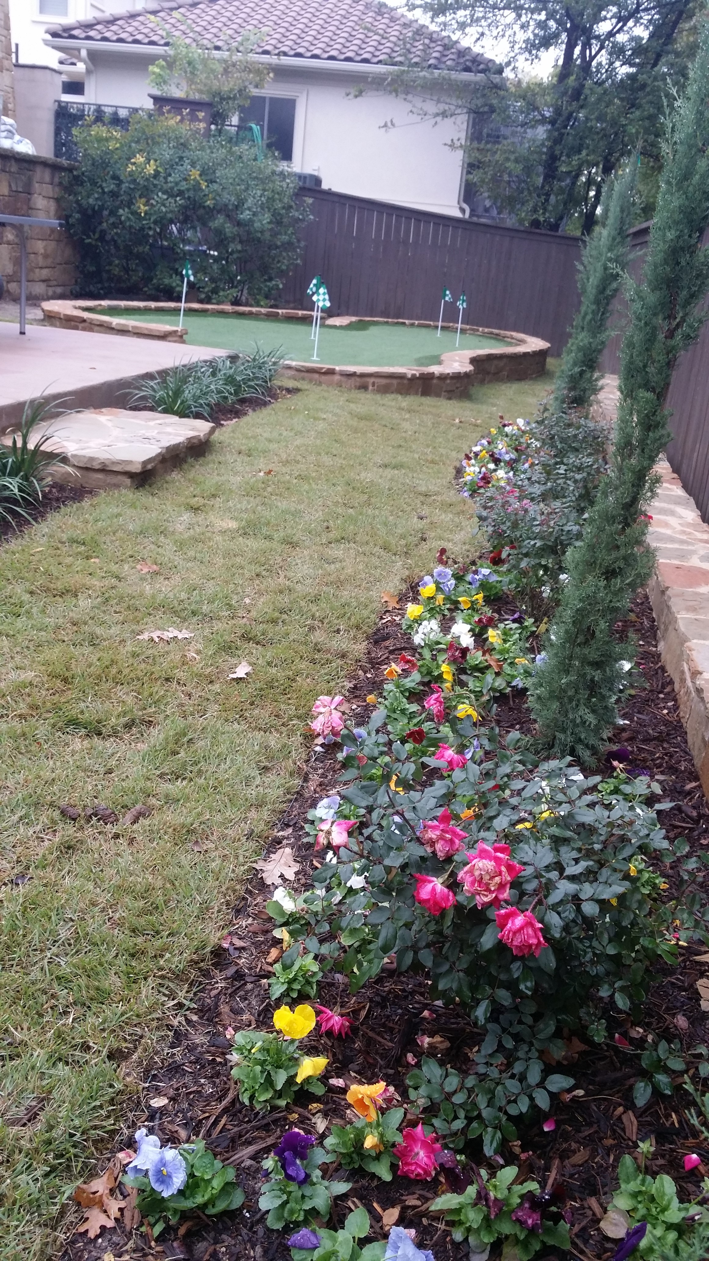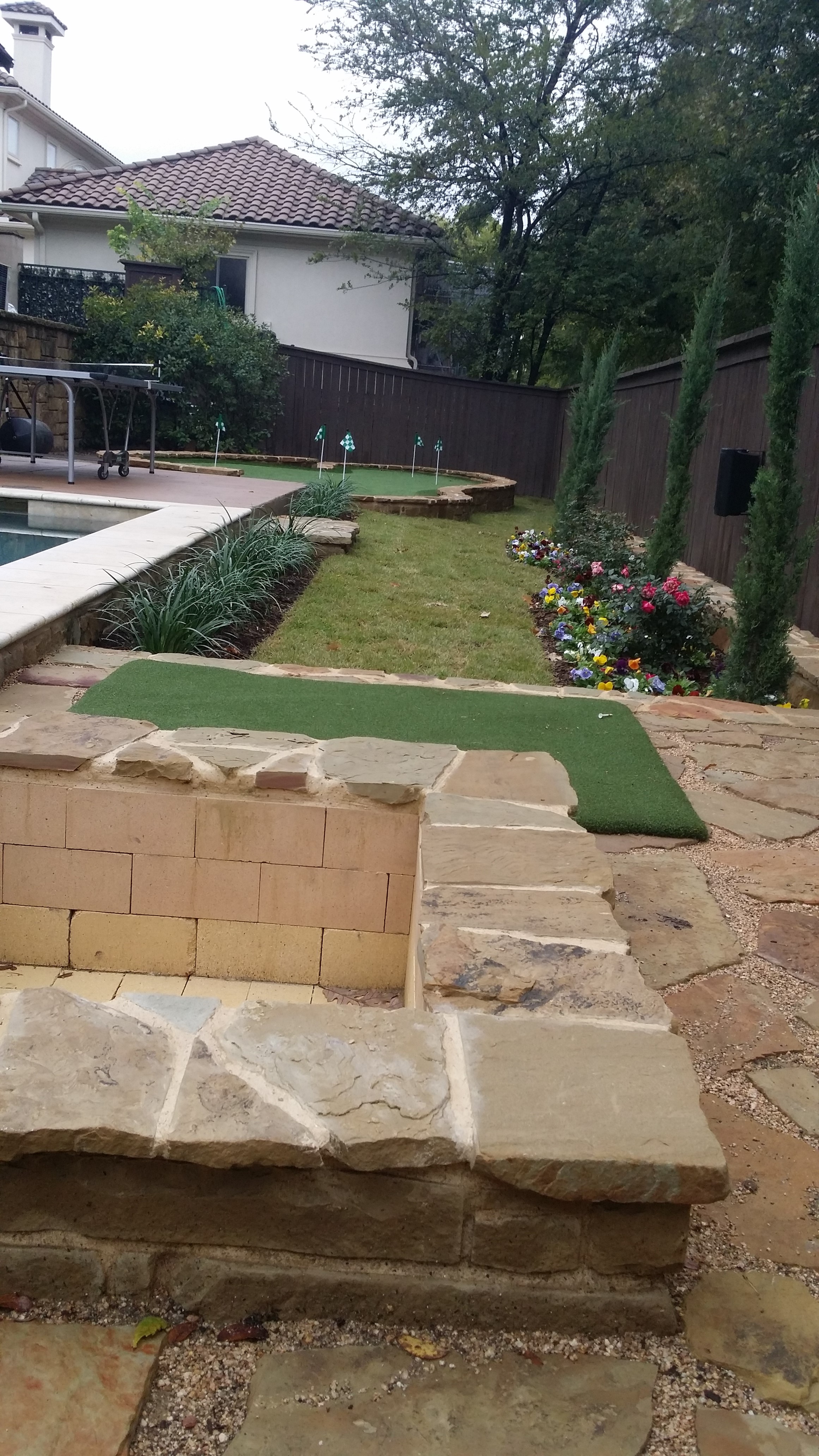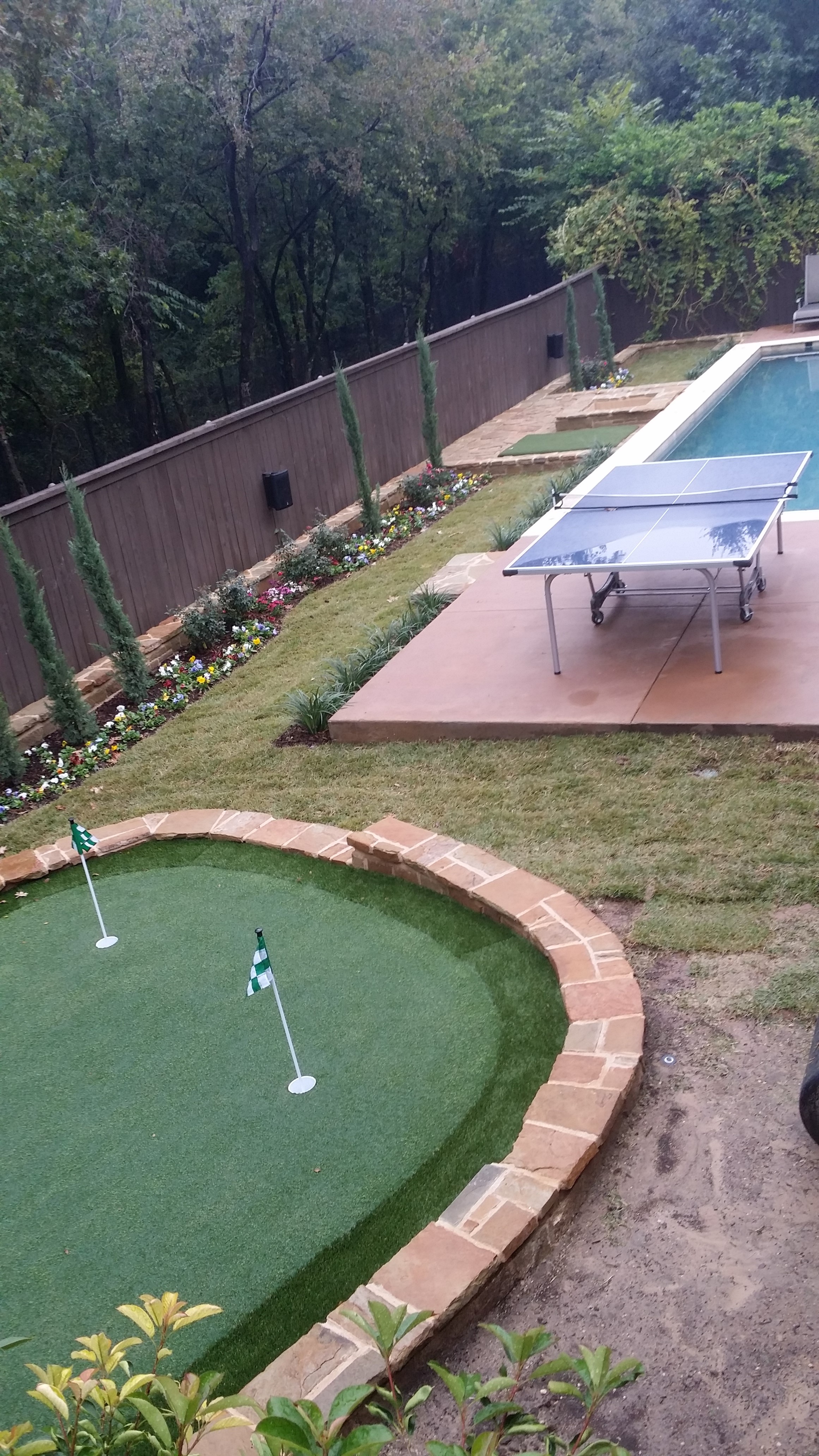 The landscaping around the putting green also added to the finished look of the backyard. Mary Kay Griffith at C.C.’s Touch of Nature did a fantastic job designing and installing the landscape with beautiful flowers and greenery, making the finished backyard really feel like a resort! If you need help with landscaping your yard, C.C’s is the place to call! (817) 732-0942.
