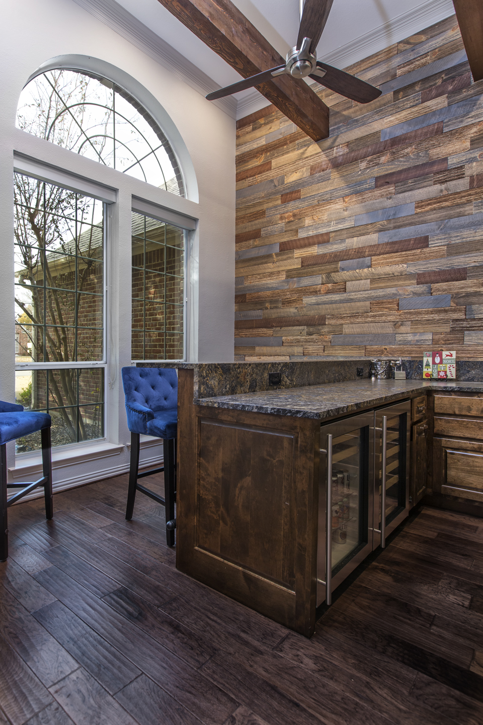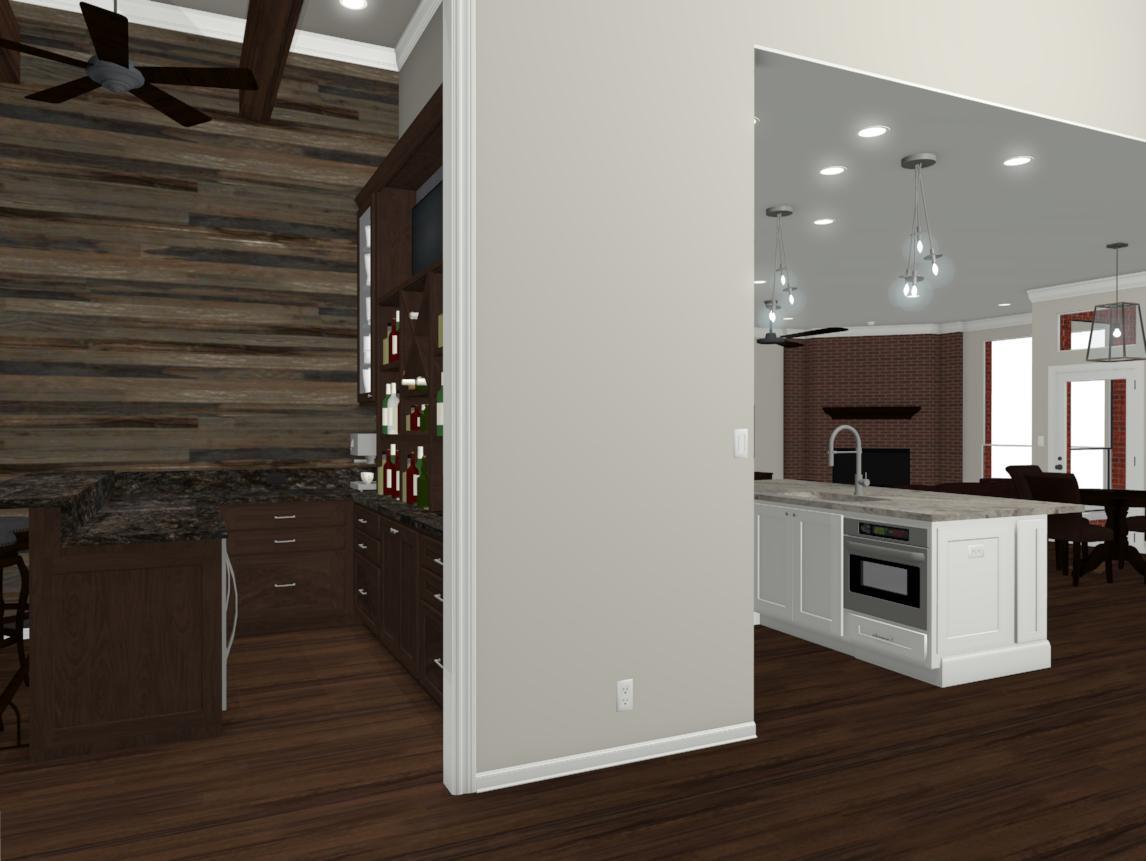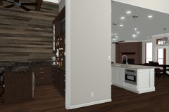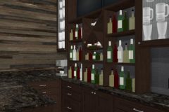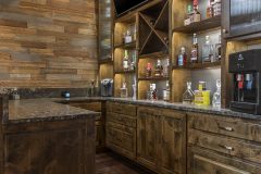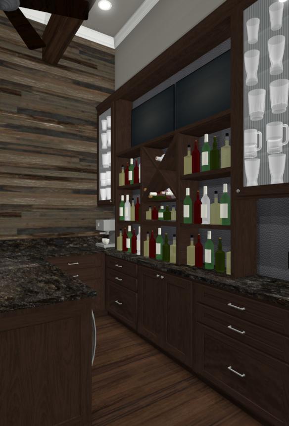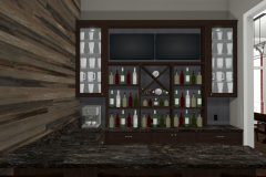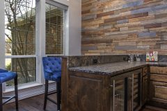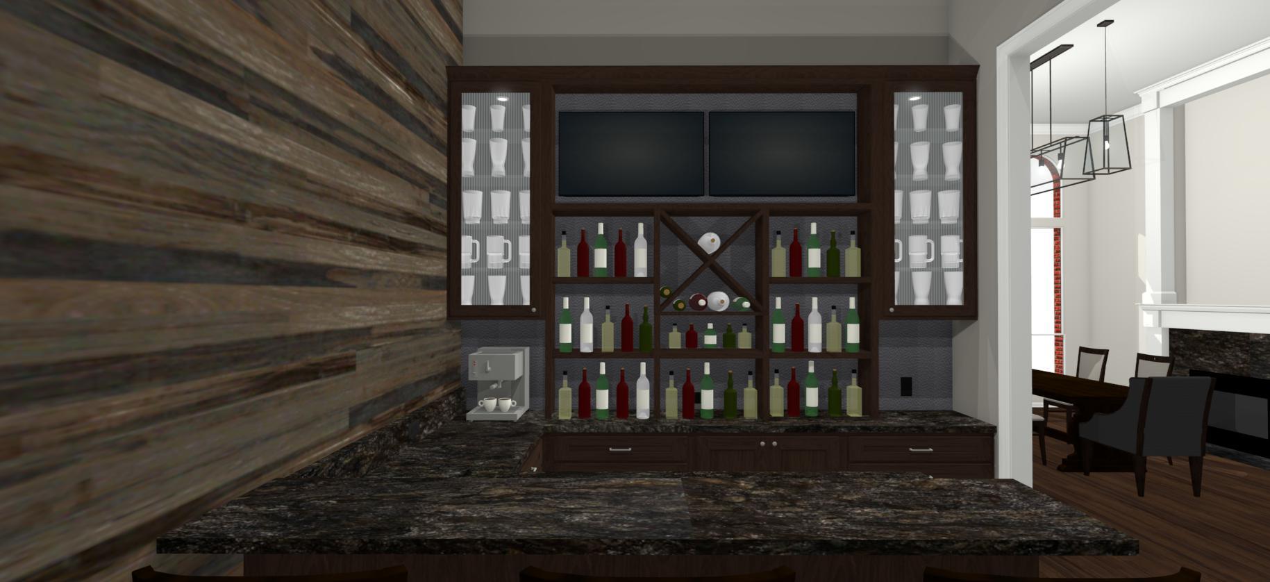 Our recent clients loved to host get-togethers of large groups of people in their home. They enjoyed socializing and desired a place guests could sit, mingle, have a few cold ones, and watch the game. As large as the existing living room was, it just didn’t meet the needs of the clients when it came to entertaining guests. The idea was brought up to convert the formal dining room into a rustic home bar — complete with backlit display shelves, an under-counter wine fridge, granite counter tops, and big screen TVs — and the clients were beyond excited! Our talented design team began to draft up ideas for the look and functionality of the remodeled room, and the project was quickly underway.