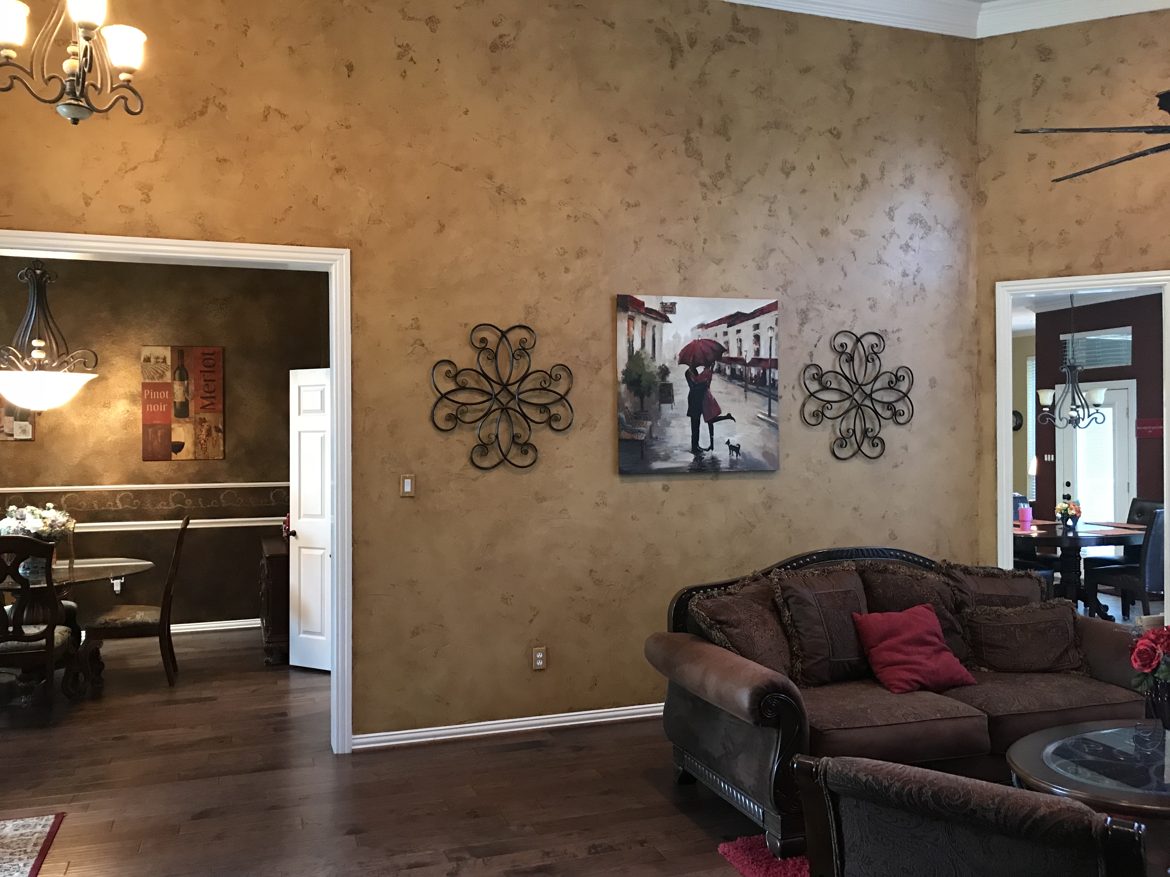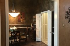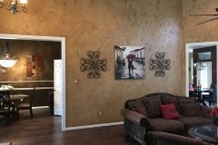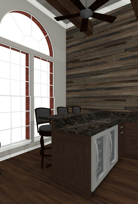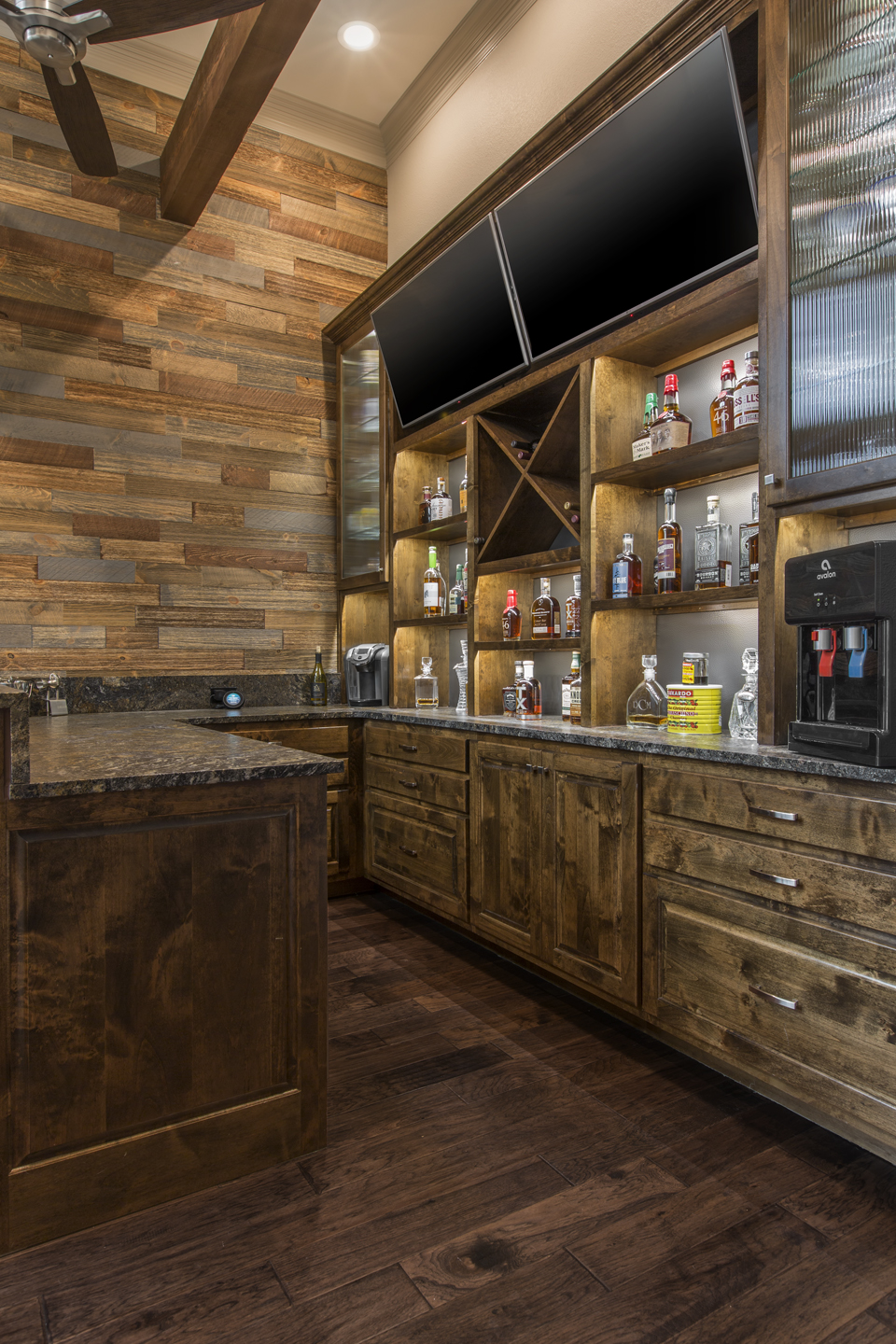 Our recent clients loved to host get-togethers of large groups of people in their home. They enjoyed socializing and desired a place guests could sit, mingle, have a few cold ones, and watch the game. As large as the existing living room was, it just didn’t meet the needs of the clients when it came to entertaining guests. The idea was brought up to convert the formal dining room into a rustic home bar — complete with backlit display shelves, an under-counter wine fridge, granite counter tops, and big screen TVs — and the clients were beyond excited! Our talented design team began to draft up ideas for the look and functionality of the remodeled room, and the project was quickly underway.
