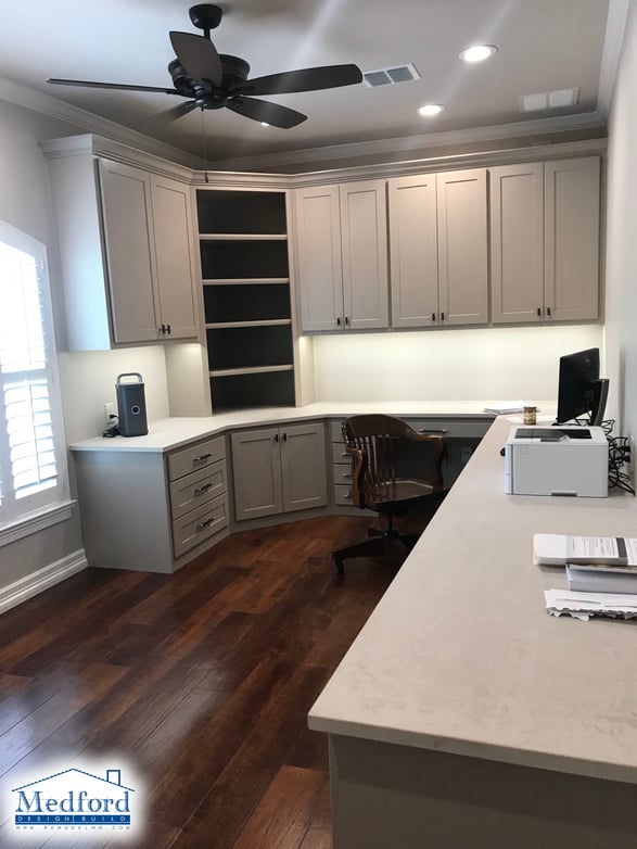 Our featured project this month involved solving a problem many work-from-home individuals face: not having a designated home office to work from each day. Our recent clients in Southlake had a large upstairs bonus room we were able to convert to a spacious home office and loft area for their kids to enjoy. We also updated the staircase, the kitchenette, and the guest bath, along with all of the paint and flooring, resulting in an entirely renovated upstairs space. Check out the blog to see the details of this fantastic transformation!