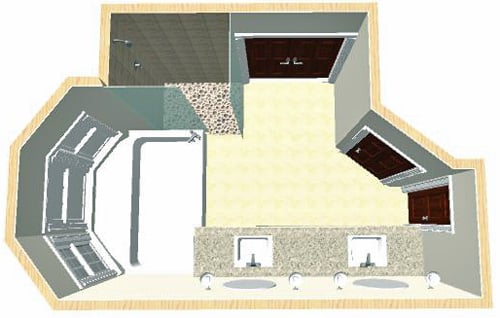 We are going to remove two of the walls and the framing above the shower. The walls will be replaced with glass. The glass will be moved to the outer edge which adds 4” of space each way. The shower is big enough to have a door-less entry. The shower head will be raised so the water sprays down rather than out.