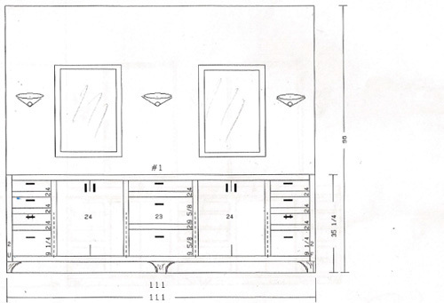 The new vanity will have lots of drawers and will be 36” high. We are going for a furniture look, so it will be made from maple, stained and have faux furniture feet. Granite top, custom made mirrors and great looking sconces will look great.
