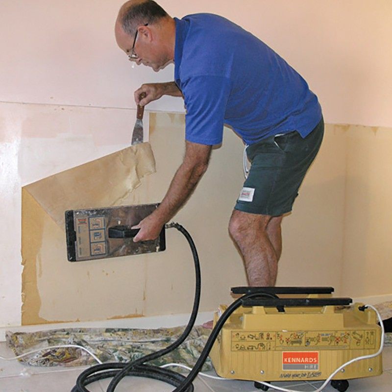 You’ll need to rent an electric steamer to loosen the remaining adhesive. Use your scoring tool to make additional tiny holes, just as you did prior to using the solvent. Next, with your gloves and eyewear on, place the steamer pad over the surface of the wallpaper, covering one section at a time. Hold it long enough so that the steam penetrates the paper and loosens the glue, but not so long as to damage the wall underneath. It’s a good idea to hold it for a few seconds and then lift to see if the wallpaper is softening. Continue until it does.