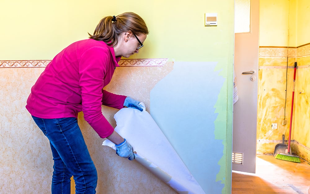 Once it has softened, remove it with a scraper or putty knife, starting at the seams and working inward. For this method, never use your fingers to peel the paper, as you can easily burn yourself!