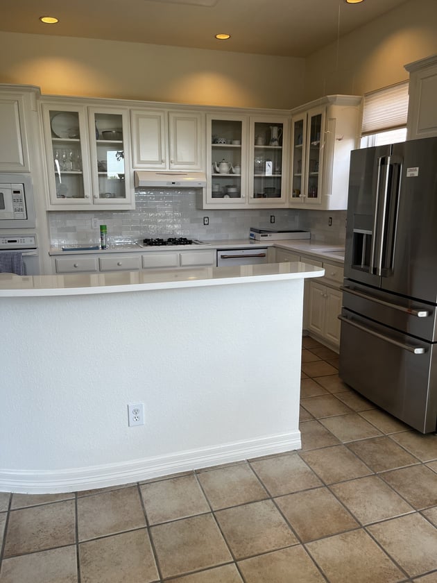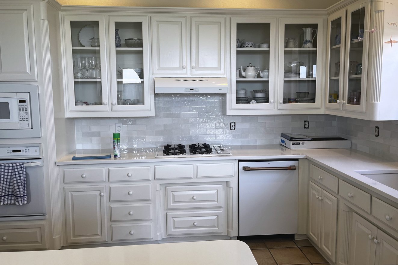Here is a recent kitchen update completed by our Mike’s Guys team. The client initially came to us because she was getting a new dishwasher and needed the counter and cabinets to be modified slightly to fit the new model. After some discussion, she expressed that the entire kitchen could use a refresh, but she wanted to avoid a complete overhaul. The decision was then made to replace the countertops and backsplash. With the same color scheme in mind, a modern ceramic subway tile and white 3CM quartz were selected to replace the originals and compliment the new dishwasher.