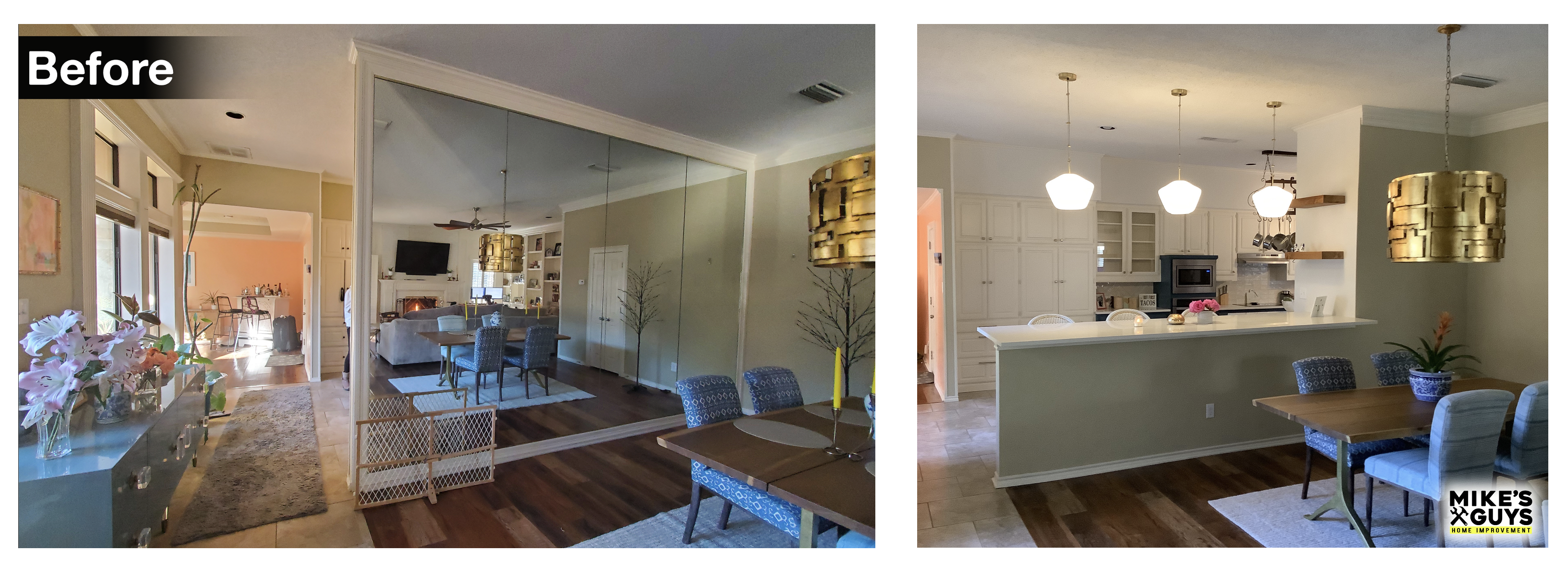 Our recent clients in Arlington, TX, came to us requesting some updates to their kitchen and neighboring dining room. The main focus was to open the area by removing the wall separating the two rooms. They also wanted to refresh the kitchen with new paint, backsplash tile, and countertops. Since this wasn’t a full-gut remodel, it was perfect for our small projects division – Mike’s Guys!