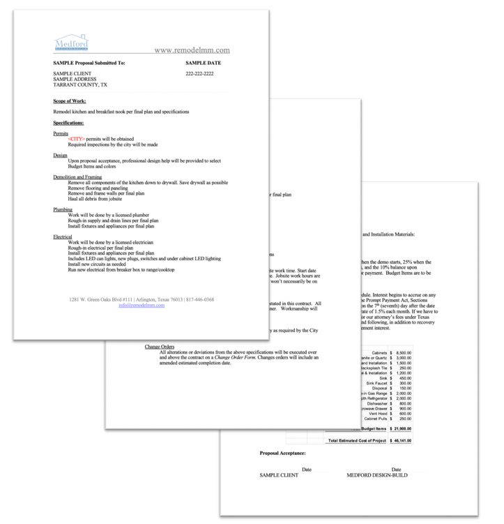 Similar to the design review, the proposal review meeting will be held at our office with your designer and our Owner, Michael Medford Jr. The full contract will be presented with the detailed Scope of Work and Budget Items Worksheet. This in-depth meeting usually takes at least an hour. By the end of the meeting, you should have a clear understanding of exactly what will be done, how it will be done, and the total cost and timeline we are proposing. The purpose of the contract is always to protect the client, the contractor, the city, and the bank, so it is very detailed.