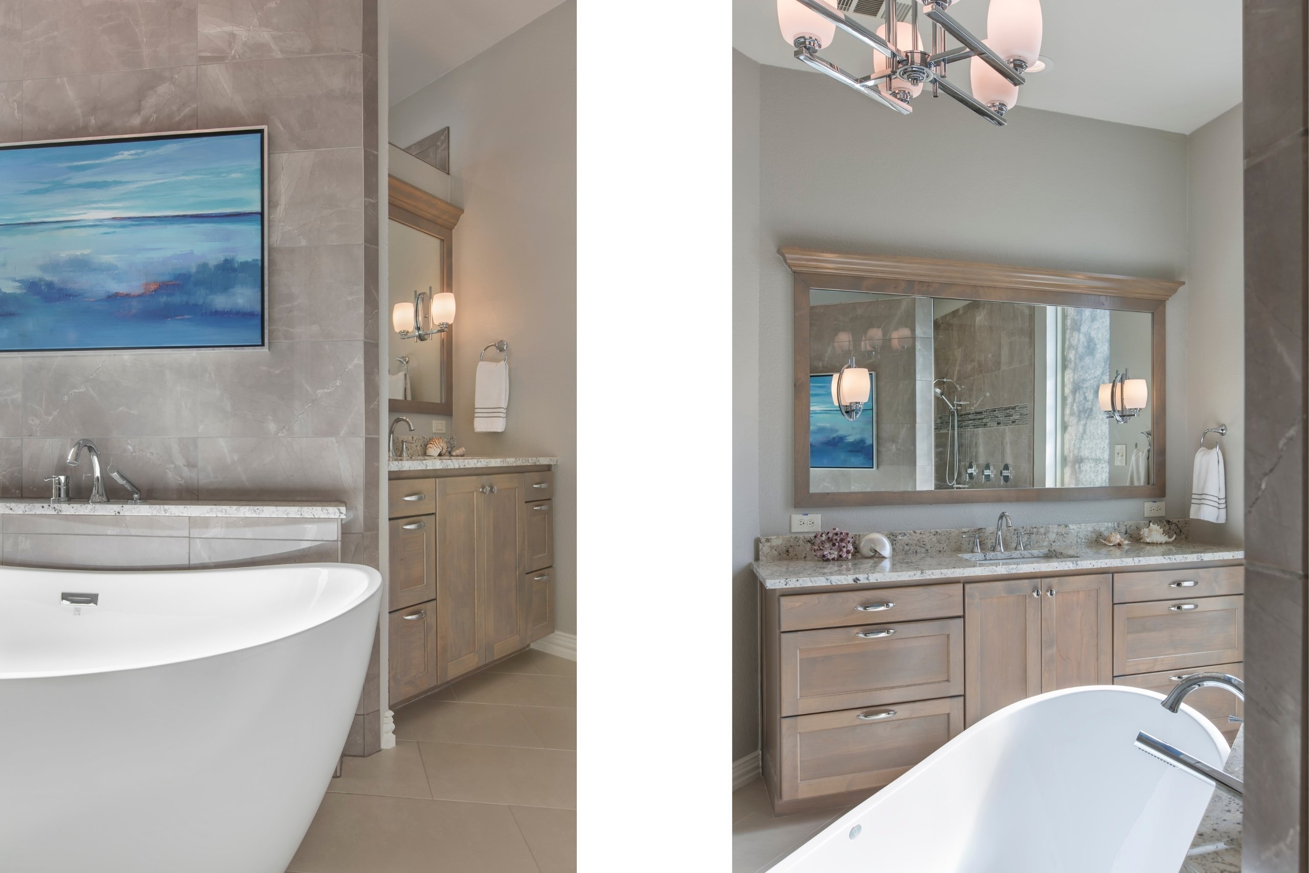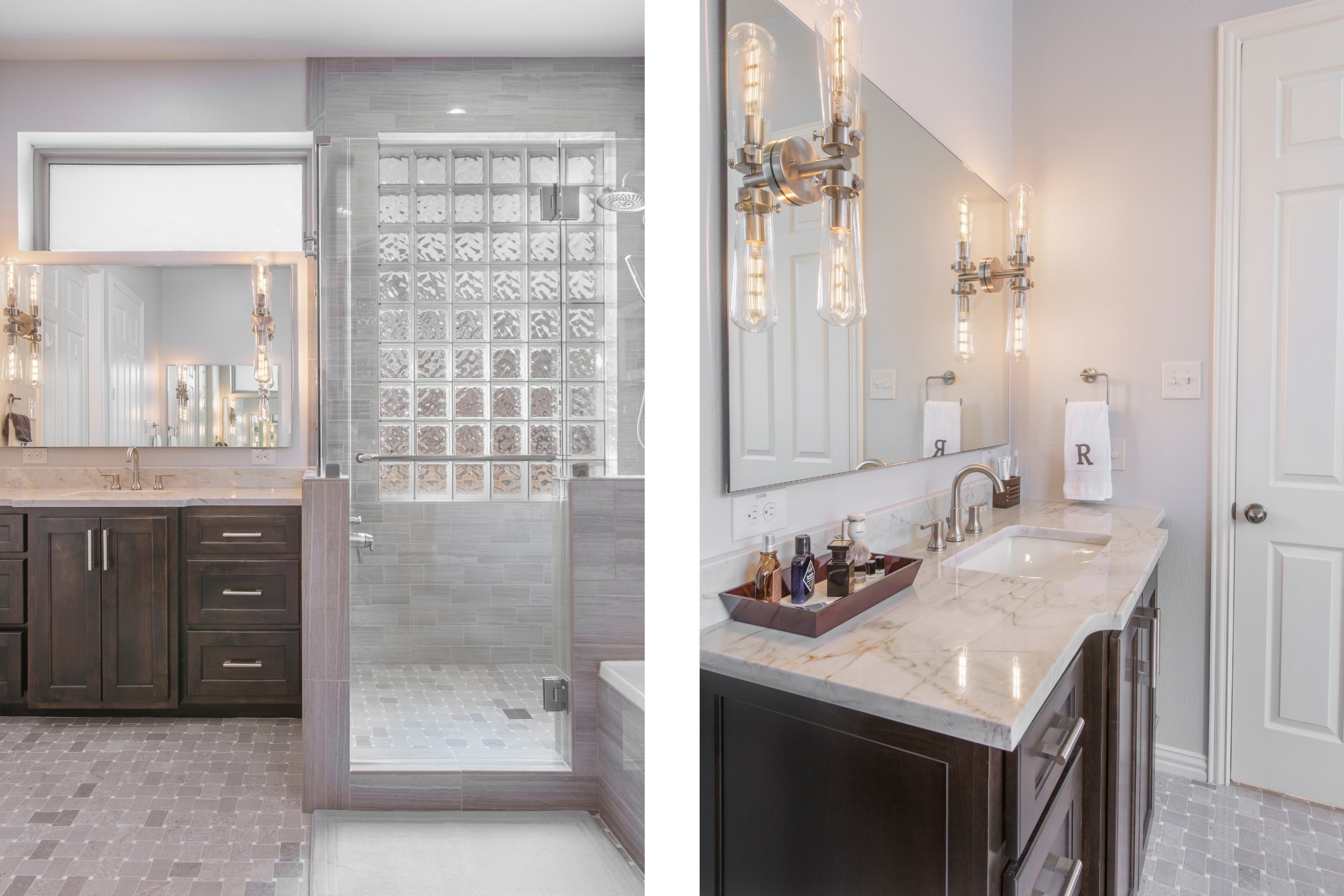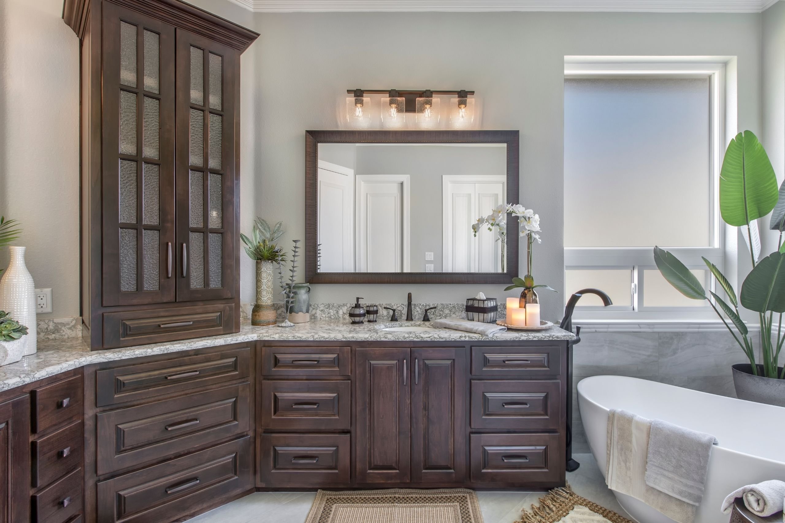 A recent bathroom remodel used rich, dark-stained cabinets with neutral tile. The result is a spa-like retreat that feels both sophisticated and grounded.