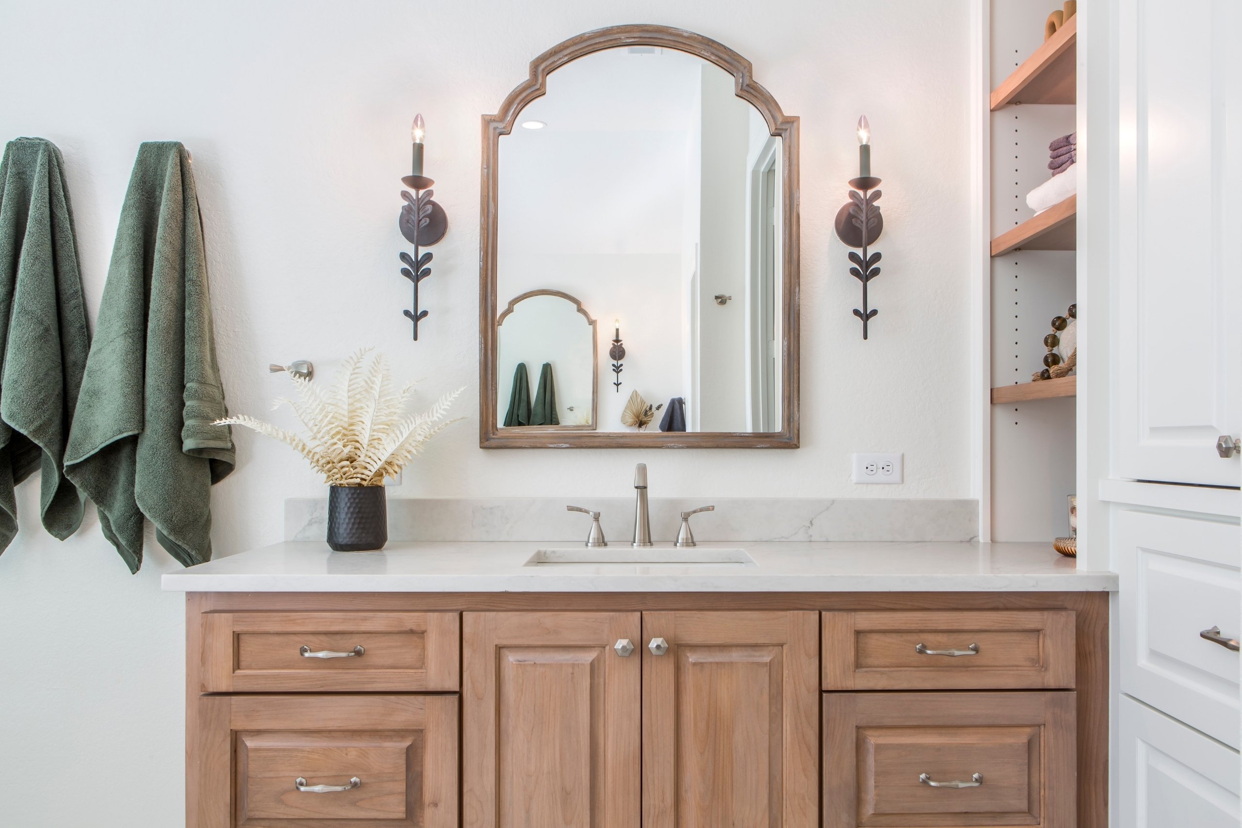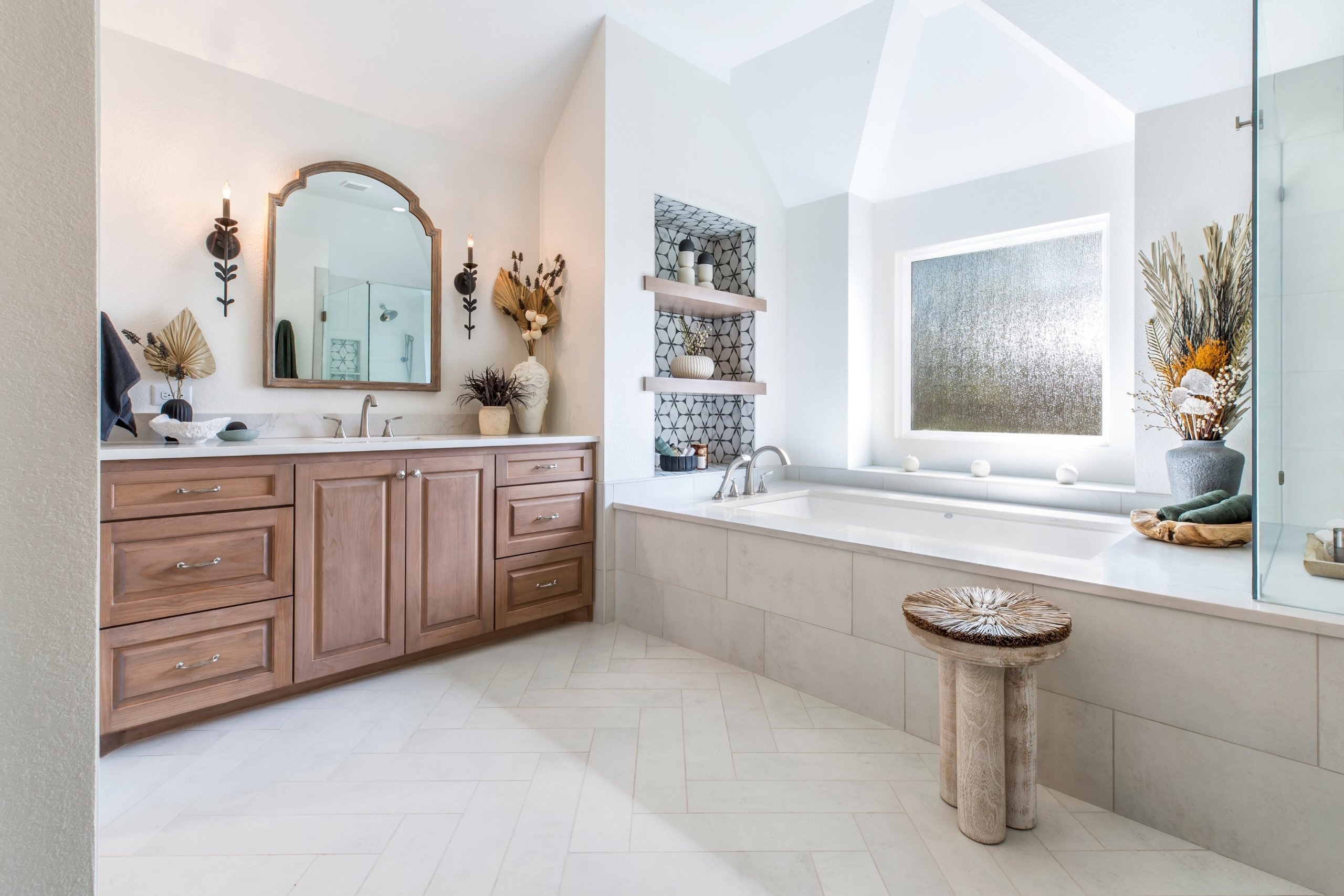 This serene bathroom remodel blends rustic charm with modern elegance. The natural wood vanity brings warmth and texture, while clean quartz countertops and subtle detailing add a refined, spa-like feel.