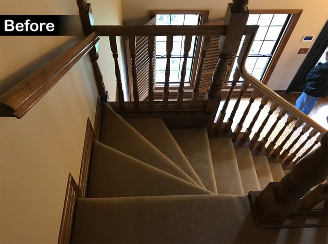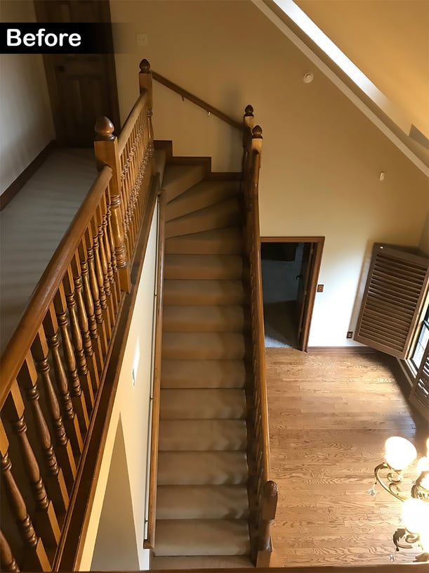 Of course, not all staircase updates are that complex. Here are a few remodels completed by our Small Projects Division, Mike’s Guys, that did not involve reworking the stairs: only replacing the railing, banisters, and flooring. These are examples of “cosmetic” remodels in which the functionality of the stairs was still up to par and the primary focus was the aesthetic.