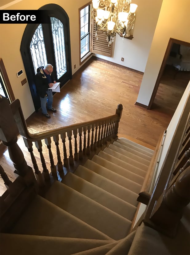 The aesthetics were also updated, with the removal of the carpet and replacing of the wood railing with a more modern iron and wood option. The clients were put at ease that we were able to provide a safe and beautiful solution to their once-dangerous staircase problem.