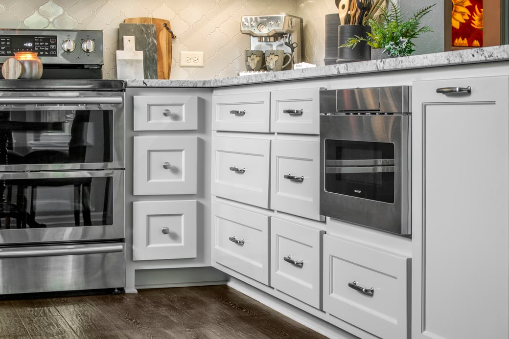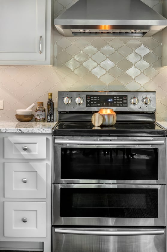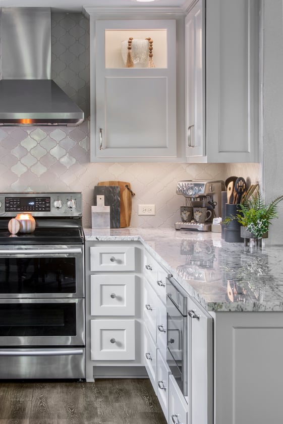 Stacked drawers were also installed on each side of the range for symmetry and quick access to utensils while cooking. The shaker-style cabinetry adds a sense of customization and character.