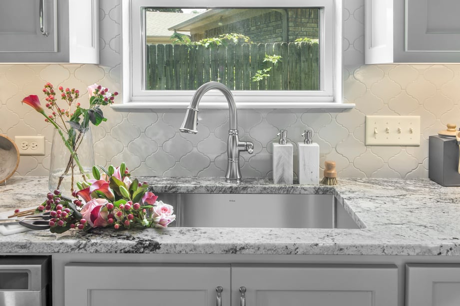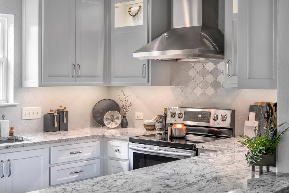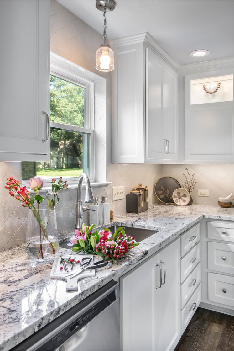Along with scraping the popcorn ceiling, strategically placed LED can lights and a decorative pendant light were installed to brighten the kitchen. LED undercabinet lighting was also included to light the meal prep areas and showcase the new arabesque backsplash tile.
