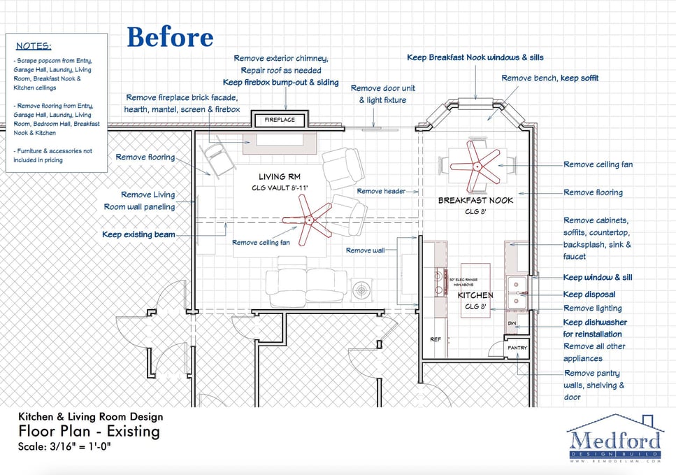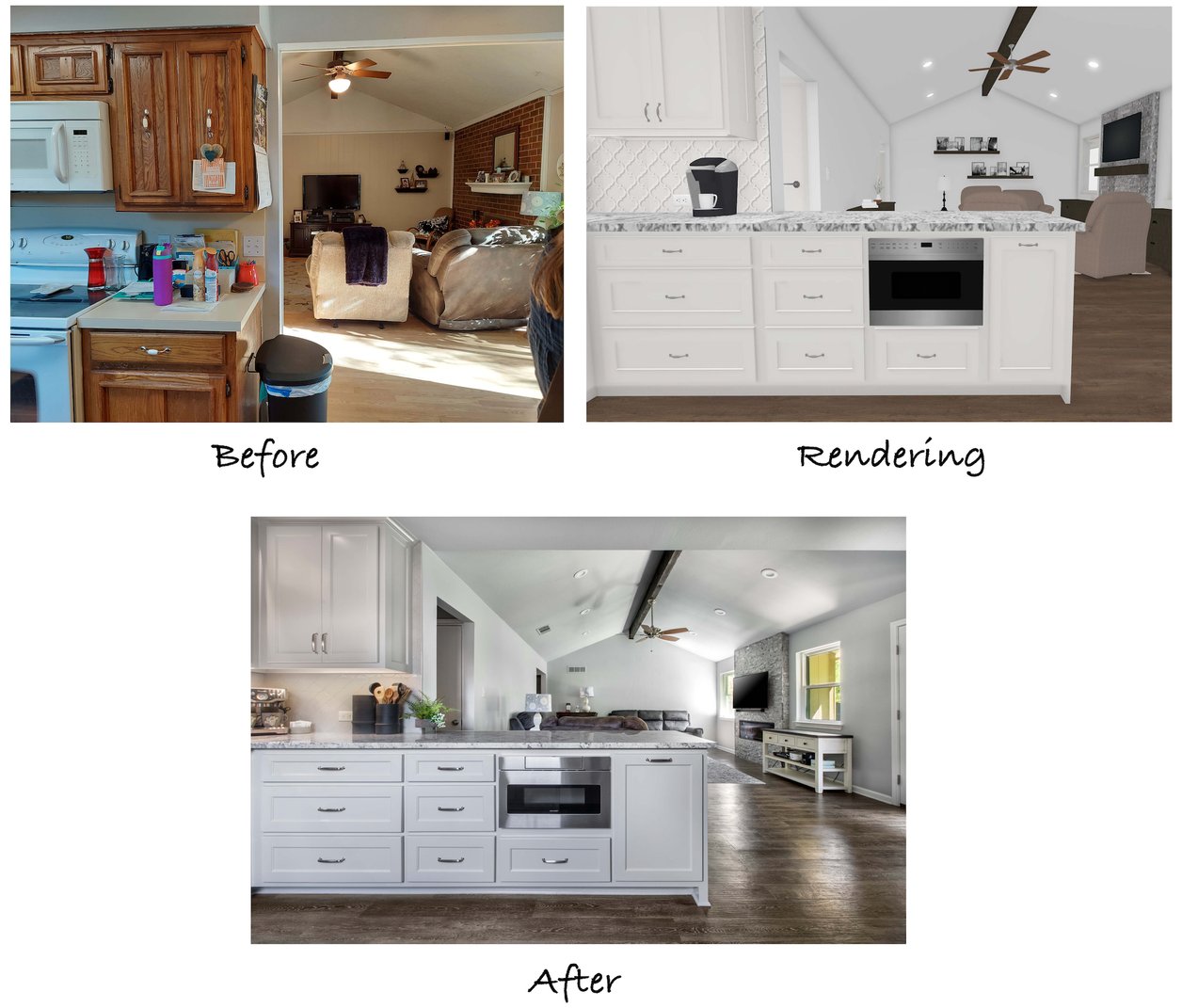 The floor plans show the updated kitchen after the wall removal, as well as the new windows and back door in the living room. The original brick fireplace spanned across nearly the entire back wall of the living room, overwhelming the space and making it dark. Removing it completely and framing windows on each side of the new fireplace created symmetry and balance. These updates made a huge impact aesthetically, but more of the structural changes occurred in the kitchen.