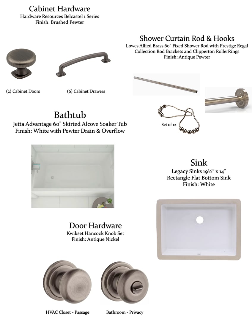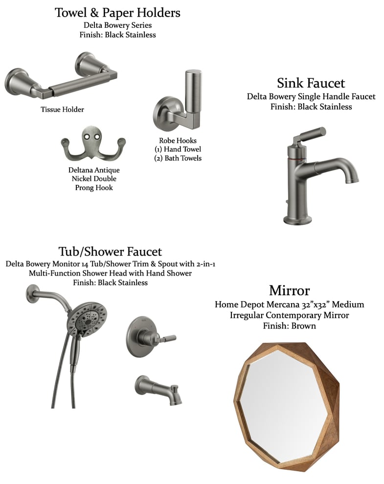 We decided to use Black Stainless faucets & towel/paper holders in this room, because her interior door hardware throughout the house is in a Pewter-type finish, and the Black Stainless is a very close match. The Antique Nickel finishes on cabinet hardware also gives that same finish tone, keeping all finishes consistent throughout the space. This finish tone also coordinates well with the dark charcoal pencil liner we finished off the wall tile with, making all these tones blend perfectly together.