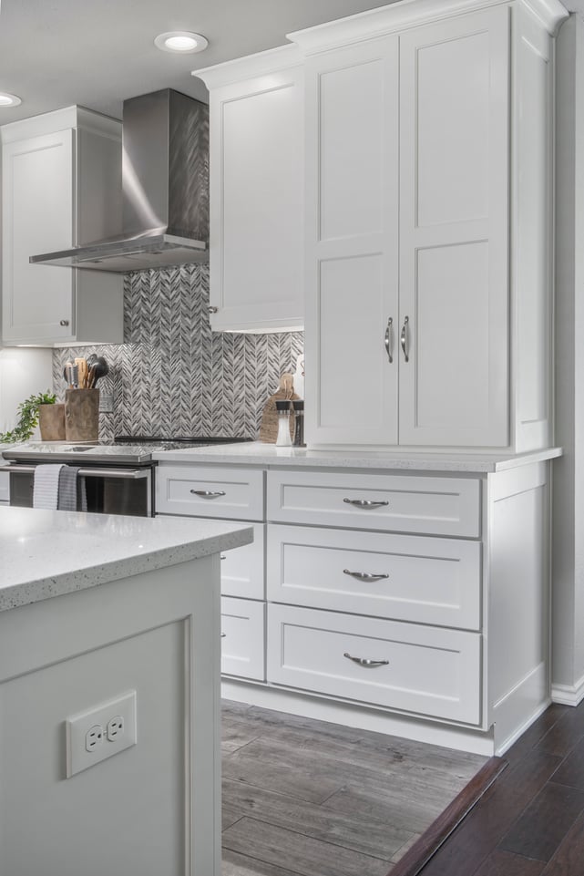 The combination of deep pan drawers and a tall pantry cabinet provide ample storage in place of the walk-in pantry that was removed. This design feature creates a much cleaner look and takes up less space by utilizing vertical square footage.