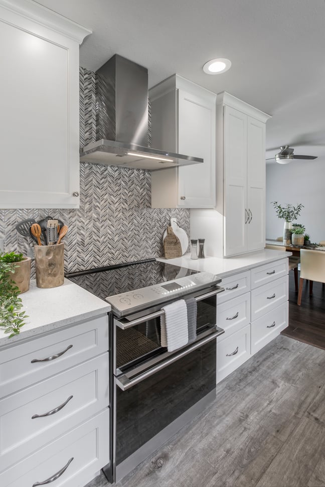 The back wall cabinetry has lots of drawer space and upper cabinets providing a ton of convenient storage. The new location of the stainless steel oven and vent hood compliment the stunning chevron mosaic backsplash forming a beautiful focal point.