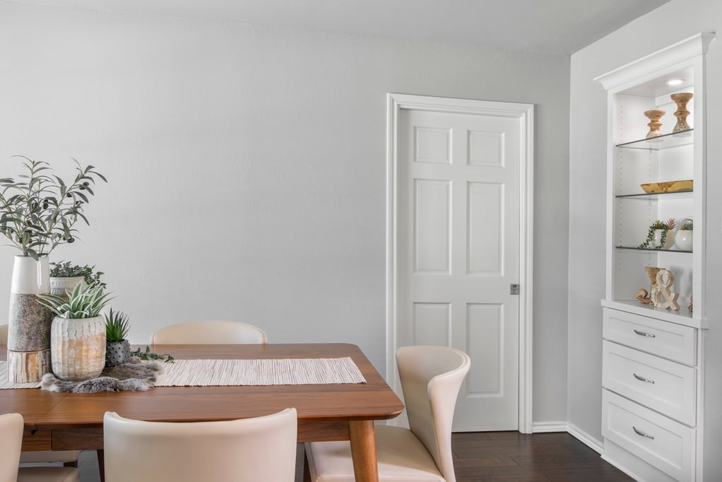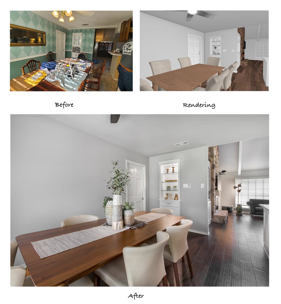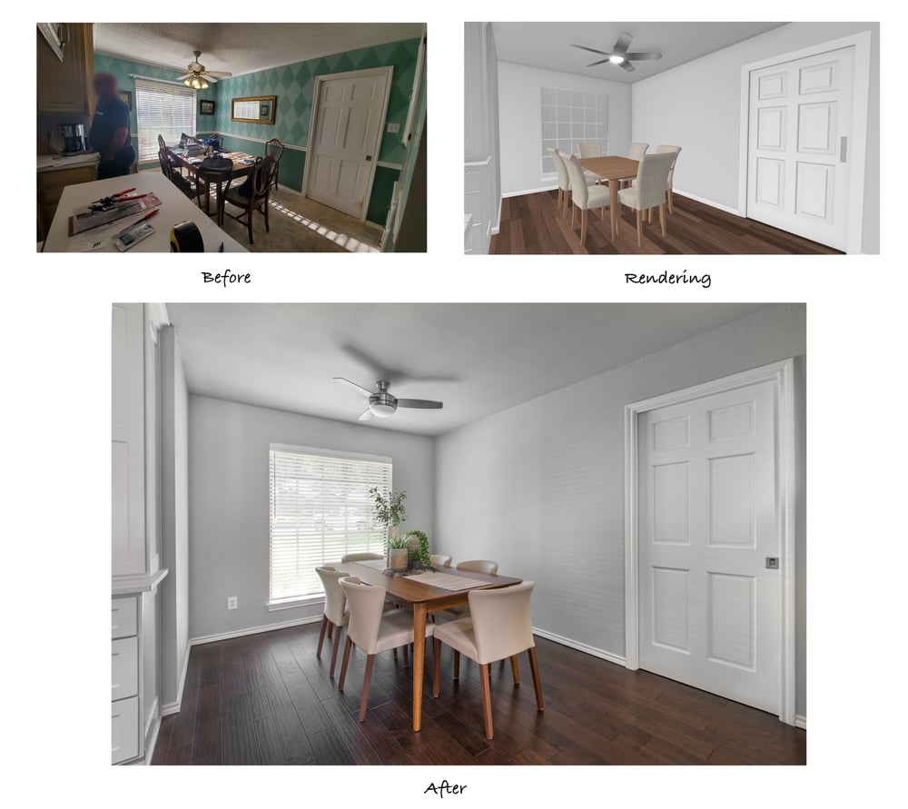 The dining room was toned down by removing the green patterned wallpaper and the dated chair rail, and then refinishing the walls with new texture and Sherwin Williams ‘Silver Plate’ paint. This cool gray is a great neutral color that complements the kitchen and provides a seamless transition from room to room. The client added a smaller but stylish table and chairs and a compact ceiling fan, which makes the room feel much larger. Removing the popcorn ceiling also contributed to a sleeker finished look.