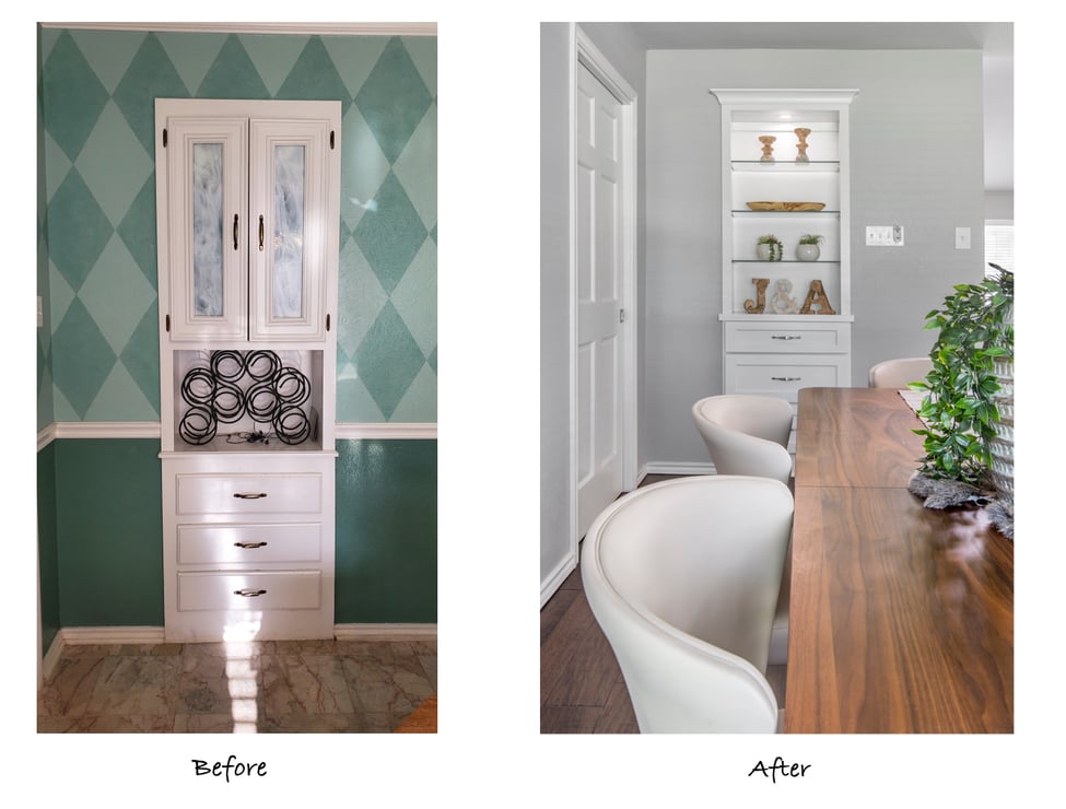 The dining room cabinet was replaced with a glass shelves and lower drawer cabinet that match the kitchen cabinets, making a great functional display space.