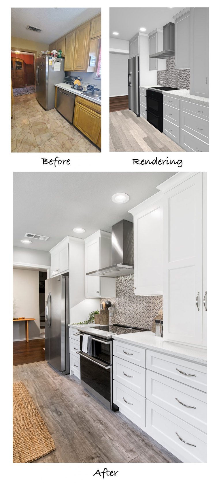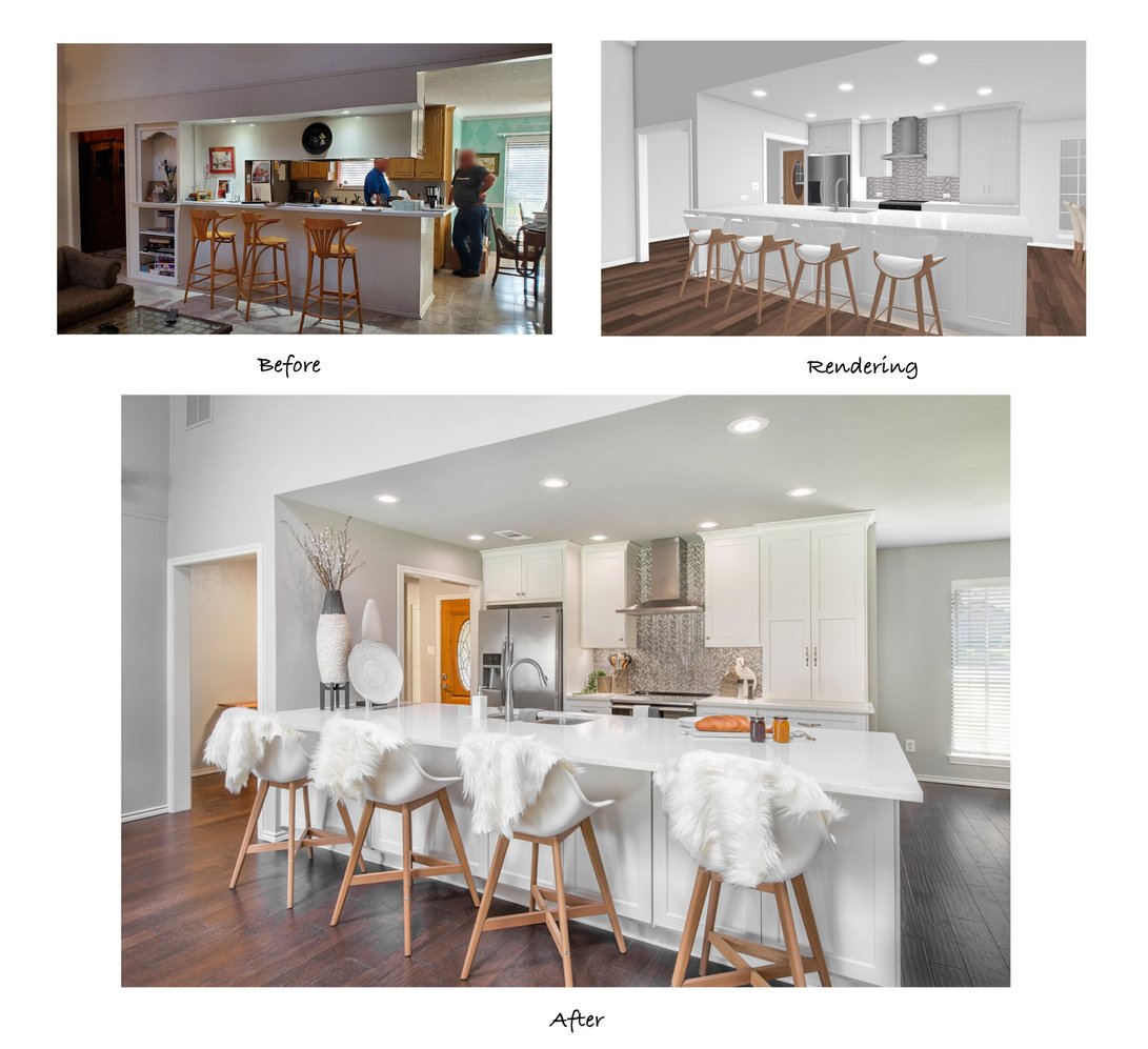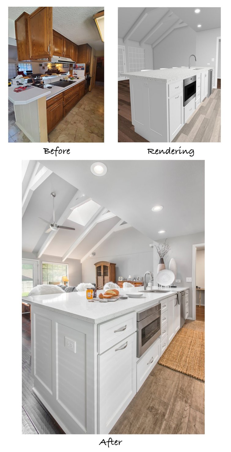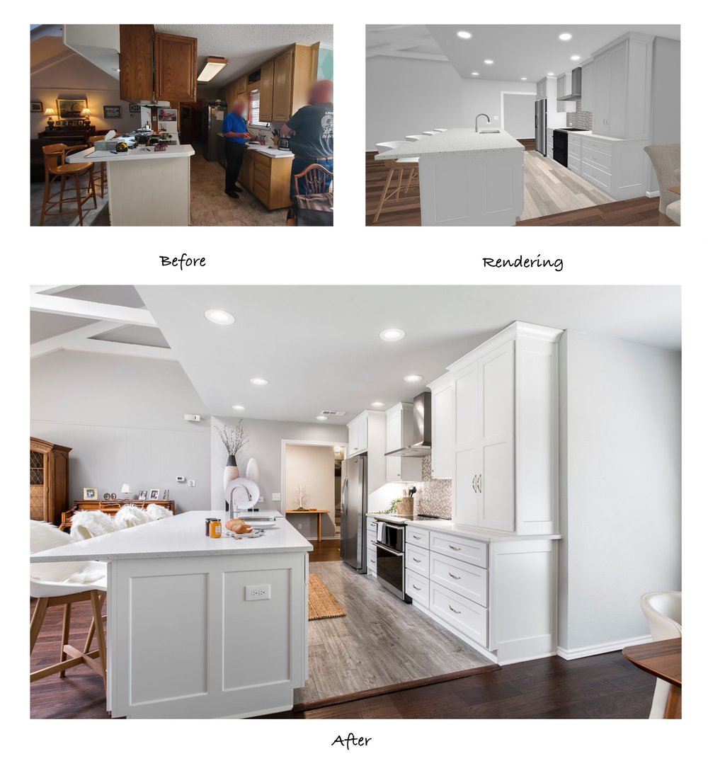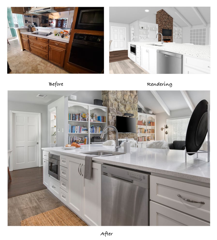 With this project in particular, it was a challenge to change much within the constraints of the existing layout. Our designers had to get creative with minimal structural modifications while still improving the kitchen’s functionality. They drew up detailed floor plans and 3-D renderings to show the clients what changes would be made and how the finished kitchen would look: