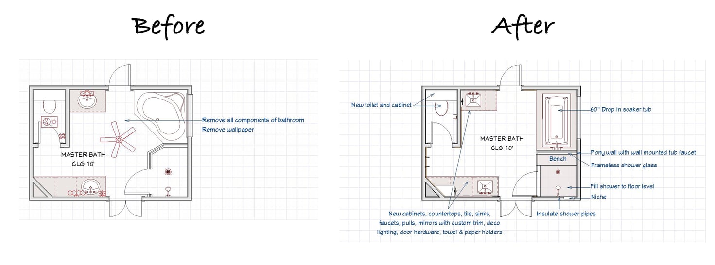 You can see in the before and after floor plans that due to the size and location of this bathroom, there wasn’t a lot that could be changed layout-wise. We opted to keep the plumbing lines where they were, so instead of reconfiguring the room completely, we updated the existing layout. The one structural change we did make was to remove the corner tub and angled shower and replace them with a 60” soaker tub and frameless glass shower. Doing this required taking in the shower 1-foot, allowing for a more streamlined look and functional tub that the clients would actually use!