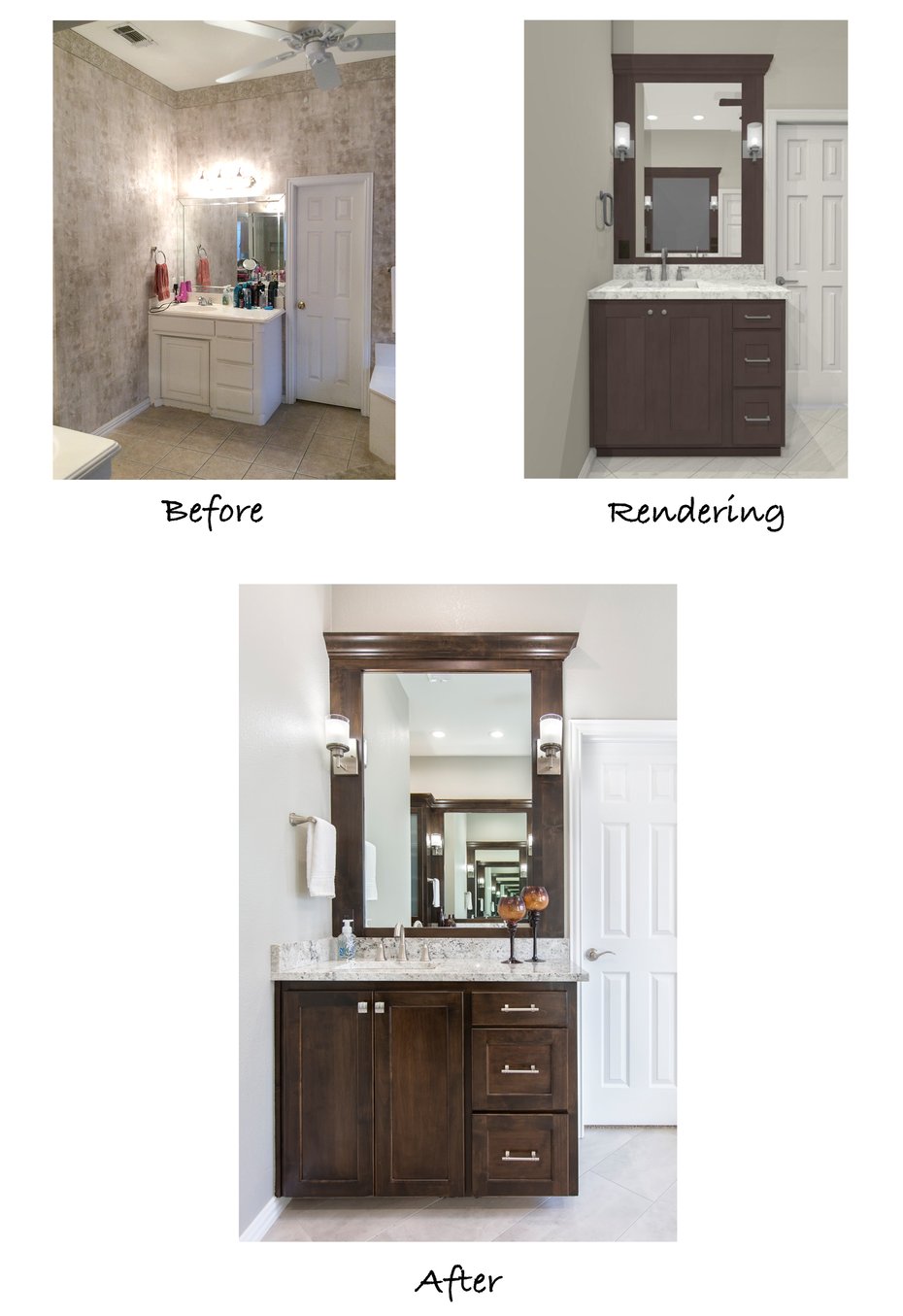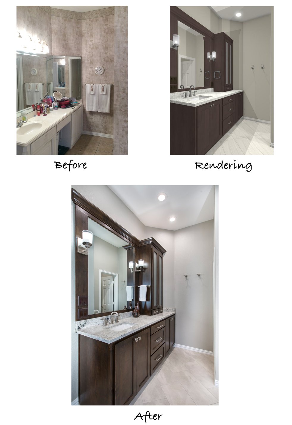 The His & Hers vanities and the toilet room remained in their initial locations, with modifications to the cabinets for improved storage space.