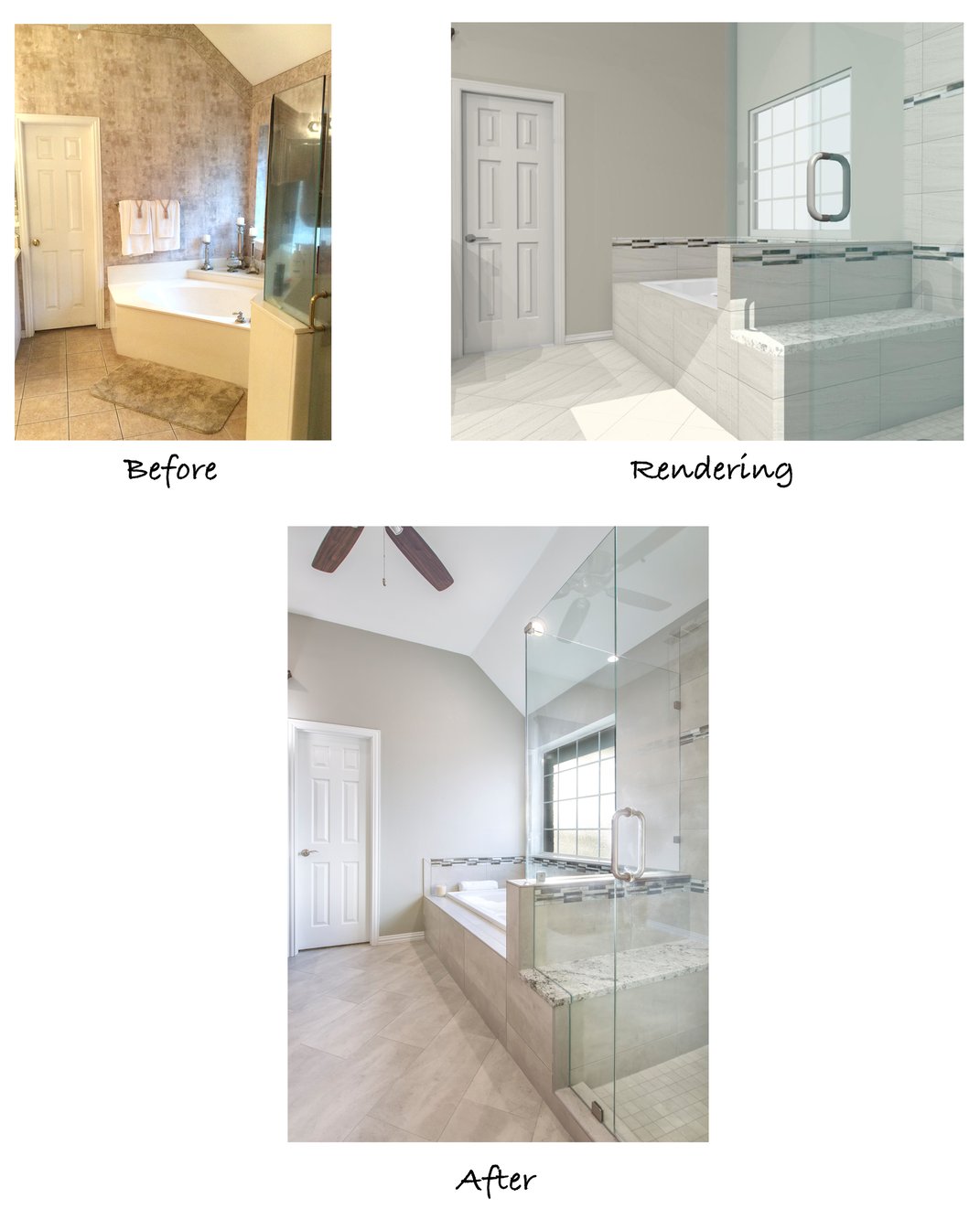 Our recent clients have a beautiful home in North Richland Hills that they’ve lived in for several years. The house was in good condition, but the clients knew it was past due for an update. One of the rooms at the top of their list to remodel was the master bathroom. The original bathroom was very dated, including pastel pink wallpaper, builder-grade cabinets, poor lighting, and limited storage space. With hopes of redesigning the room for improved style and functionality, they contacted us to address their needs. Our knowledgeable team of designers met with them in their home, discussed the issues and possible solutions, and provided the clients with a clear course of action to get the project done.